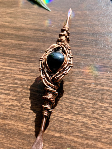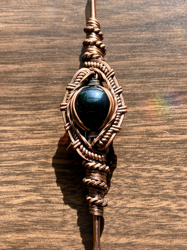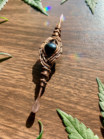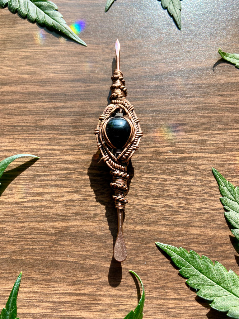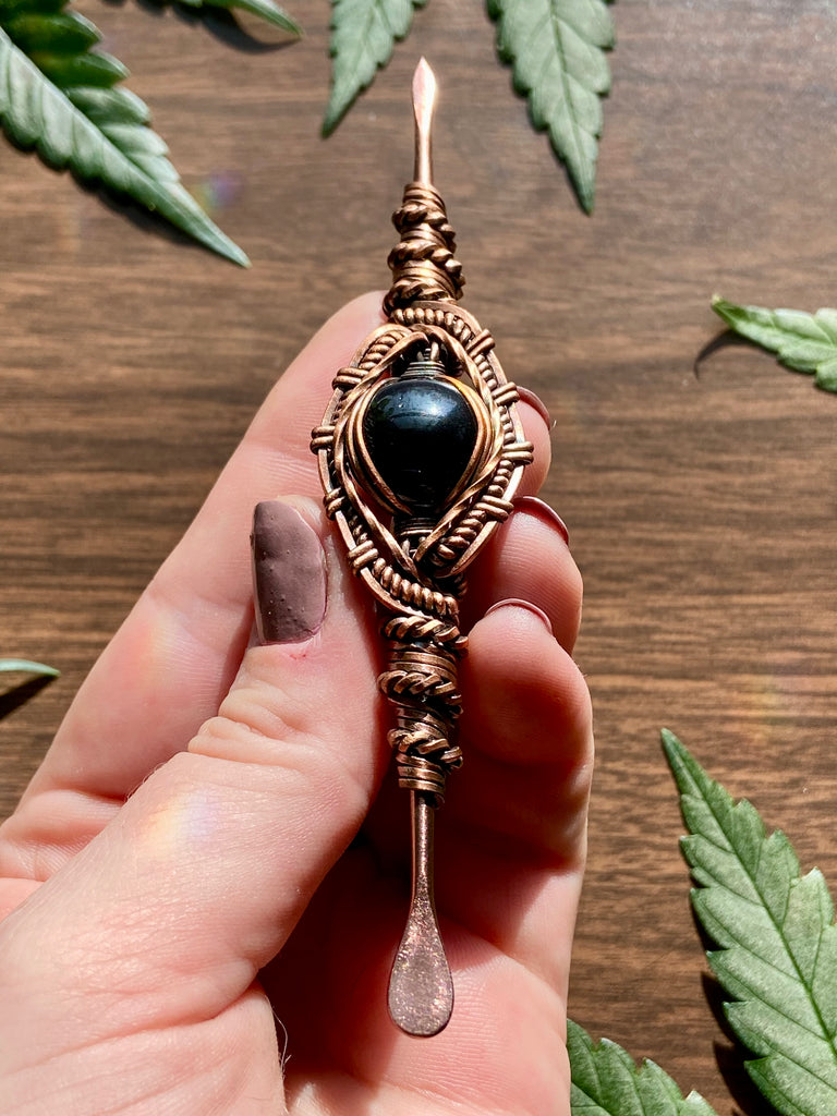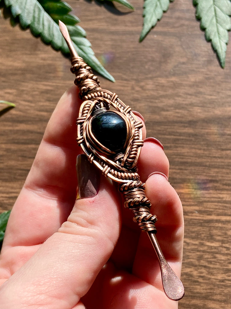 Five inch rose gold plated stainless steal dabber, wire wrapped in copper with black onyx. Finished with a patina and polish.