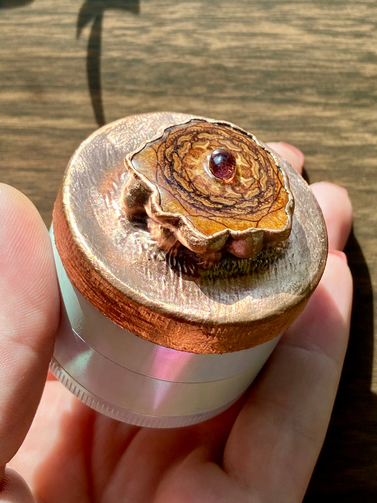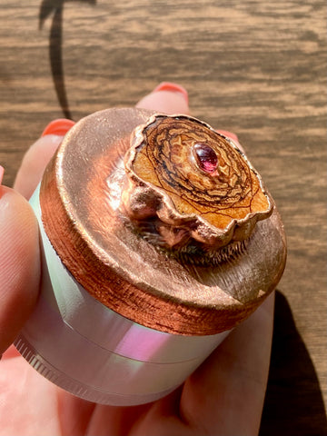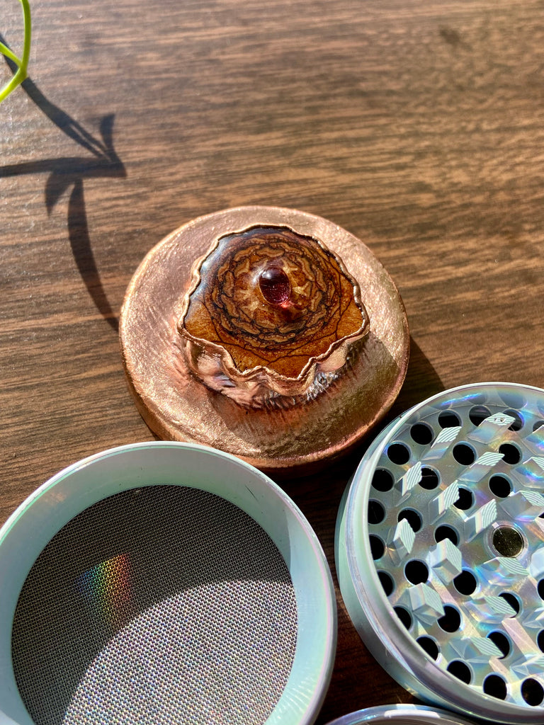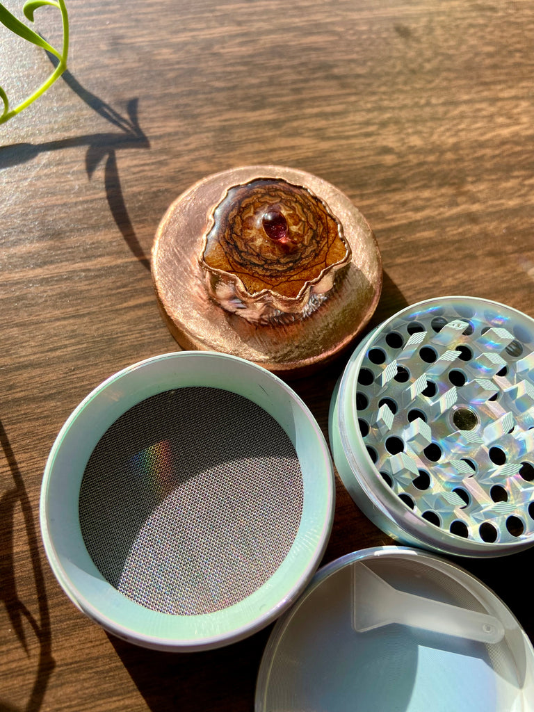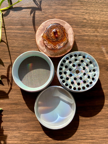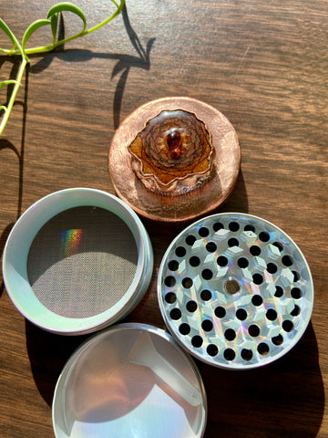 This radical holographic aluminum grinder is 1.5” tall and 2” wide. It separates into four sections, ideal for catching the finer bits in the bottom layer. Also includes a small plastic scoop/scraper.