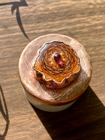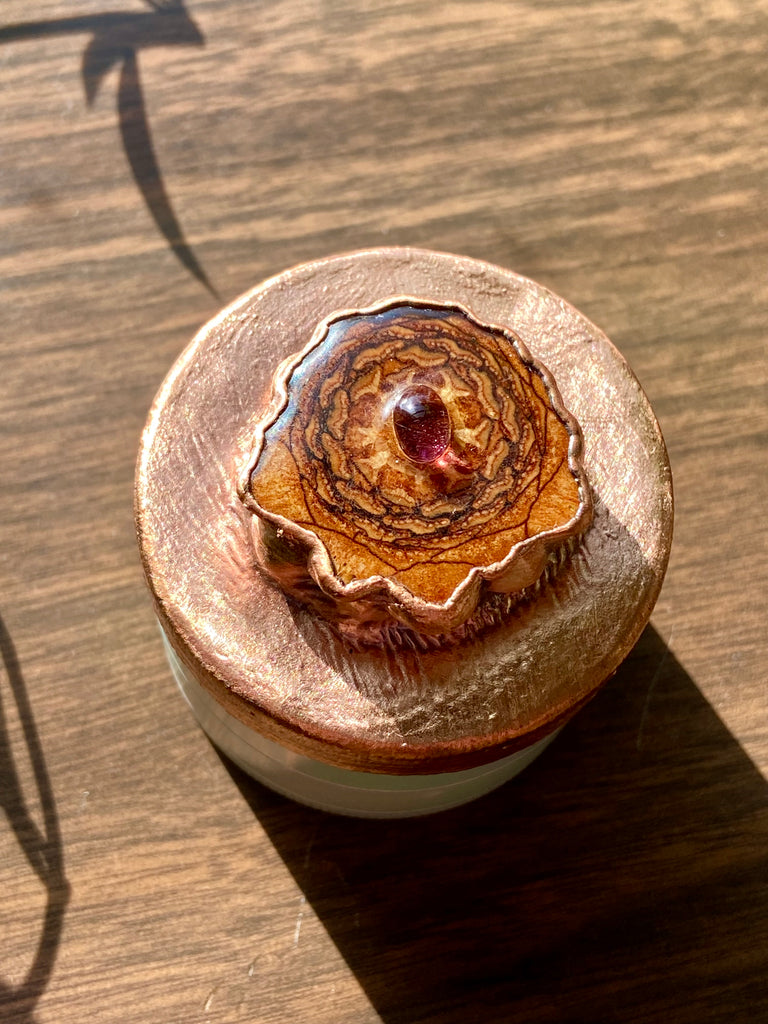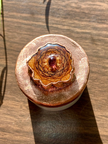 Electro formed in copper metal with an incredible pinecone slice featuring amethyst! Finished with a patina and polish.