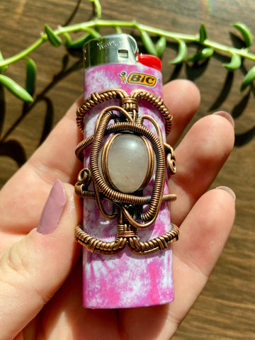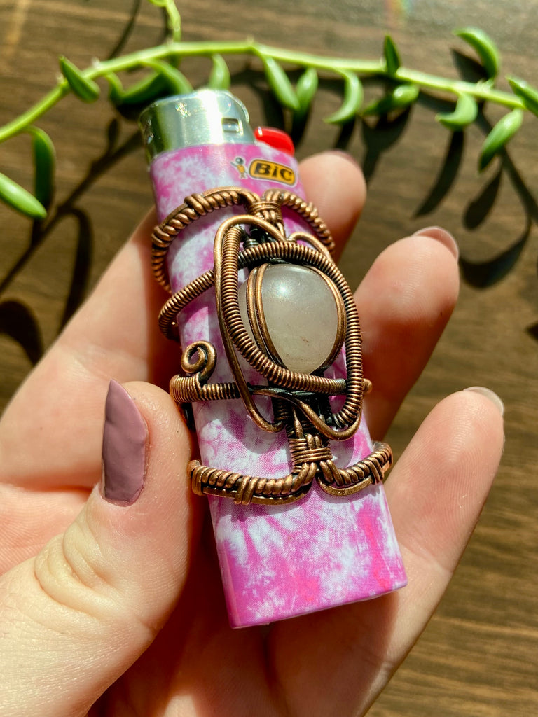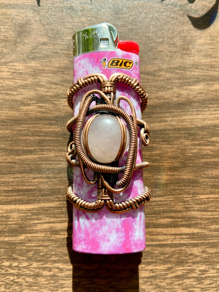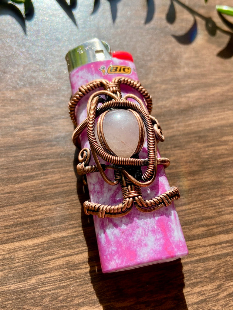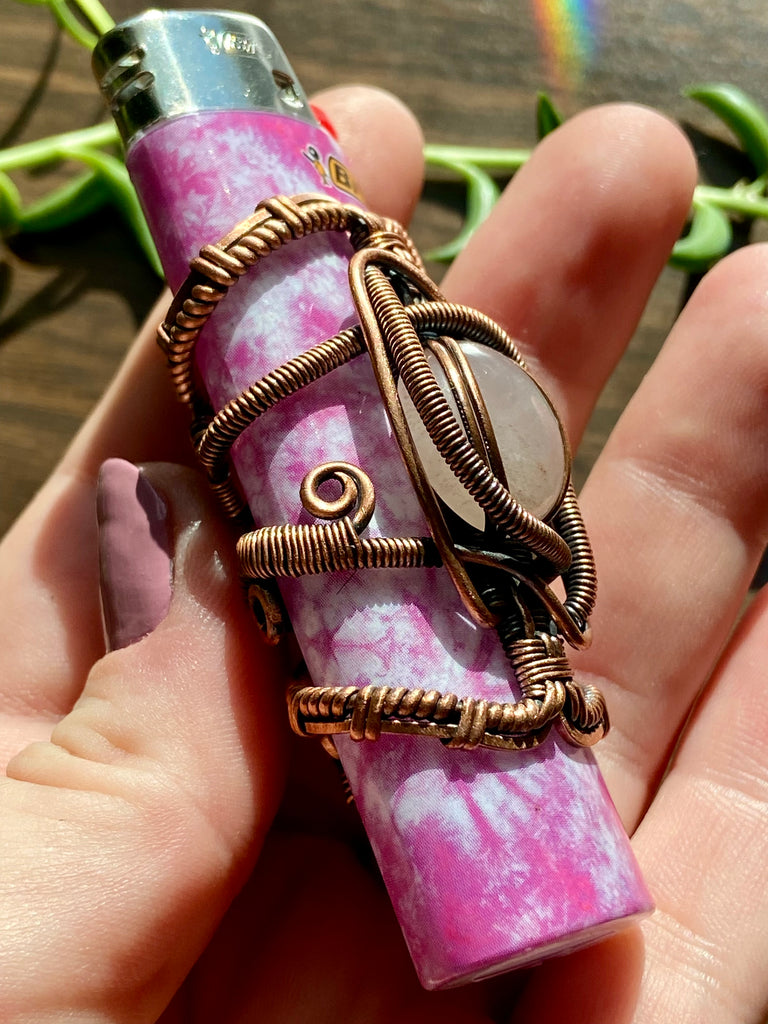 Copper wire wrapped lighter case with a stunning pink rose Quartz, finished with a patina and polish. Purchase includes one bic lighter & case.