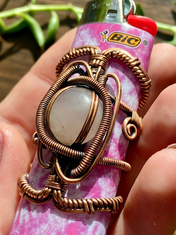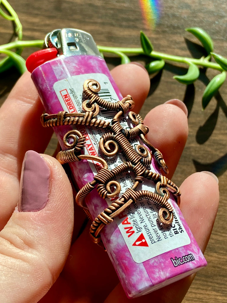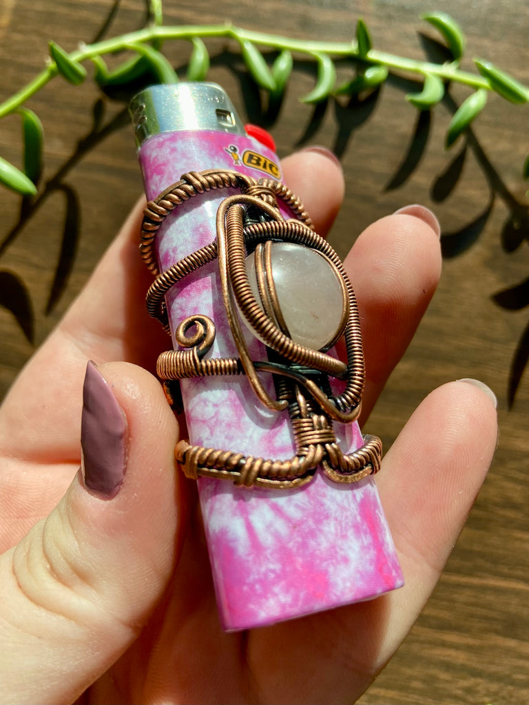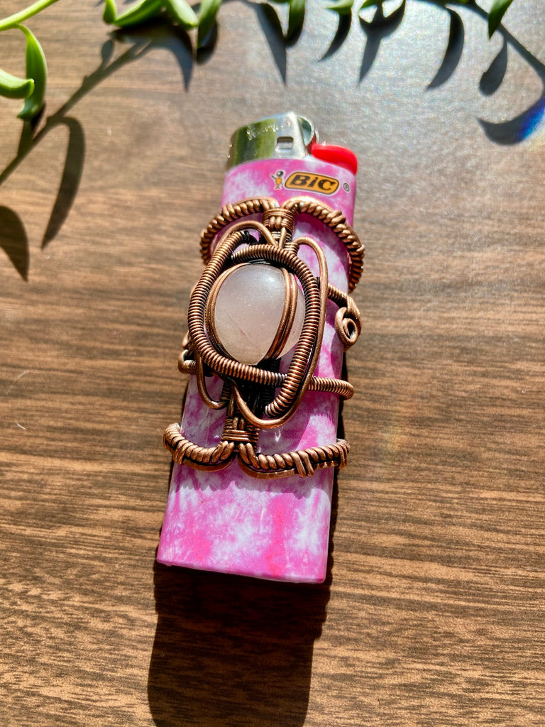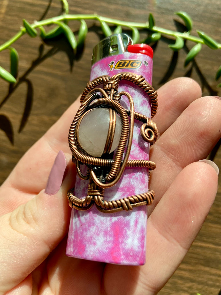 Copper wire wrapped lighter case with a stunning pink rose Quartz, finished with a patina and polish. Purchase includes one bic lighter & case.