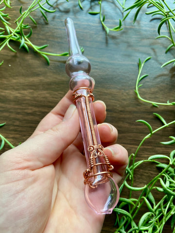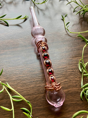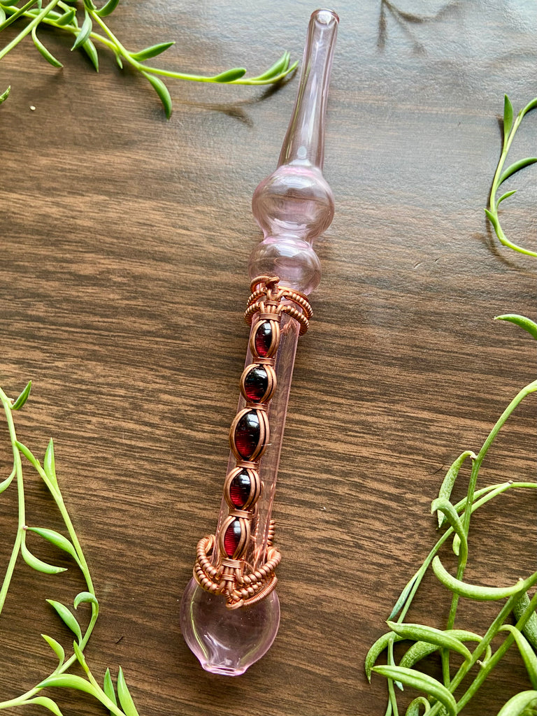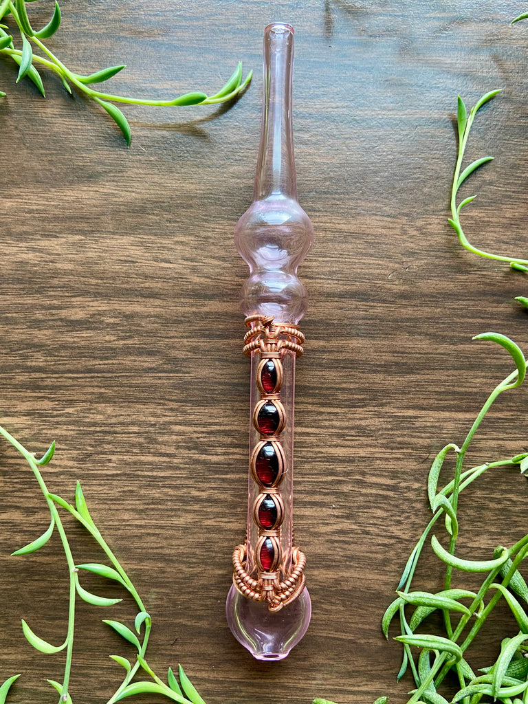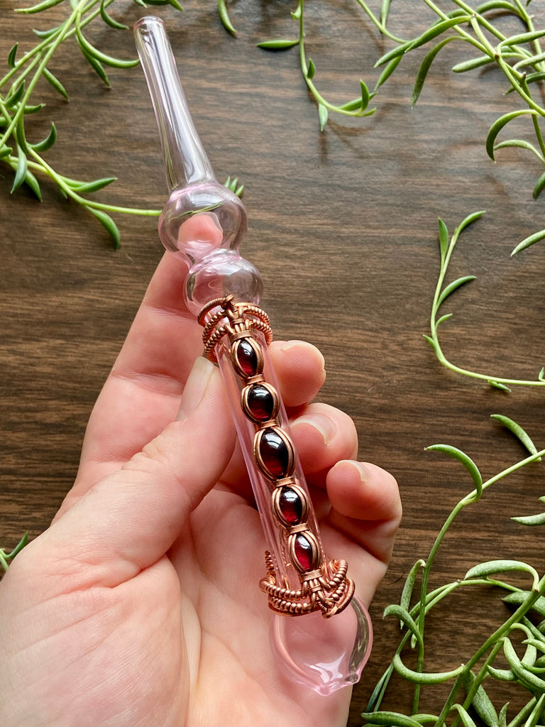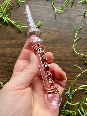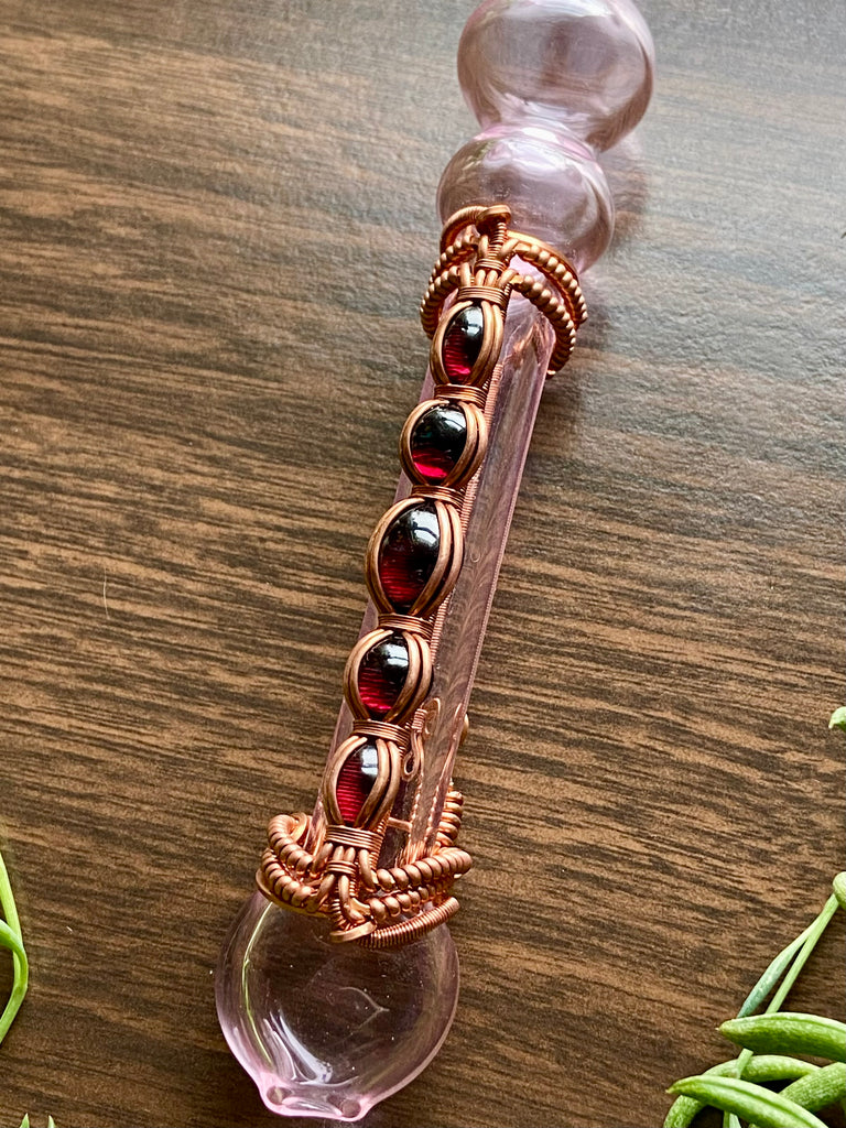 7 inch borosilicate pink glass nectar collector wire wrapped in copper with five lovely hot pink garnet gems. Wrapped in bare copper!