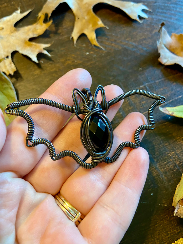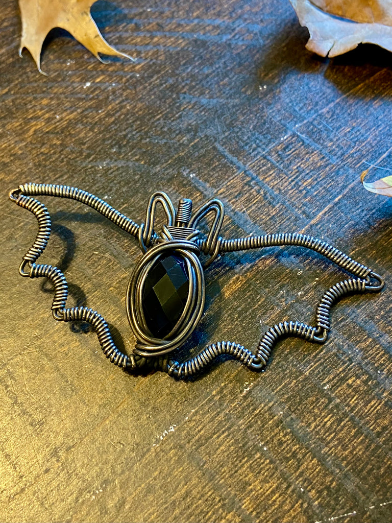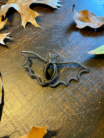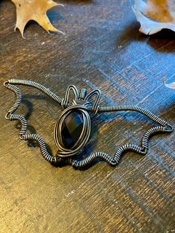 Copper wire wrapped bat pendant with a faceted black onyx body. Finished with a patina and light polish. Comes with an adjustable black rope necklace.