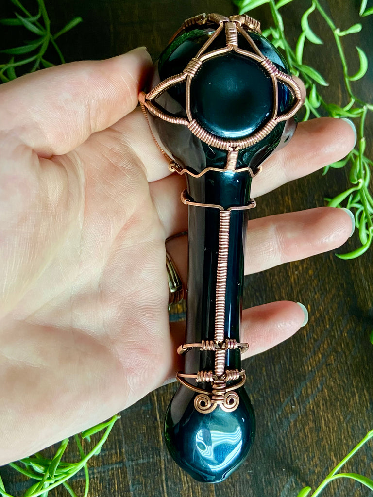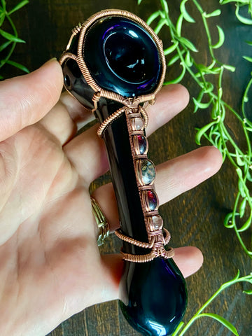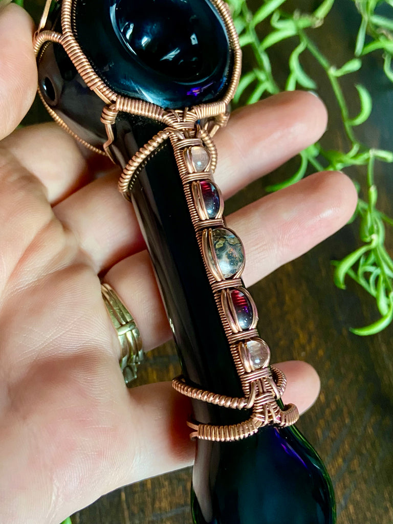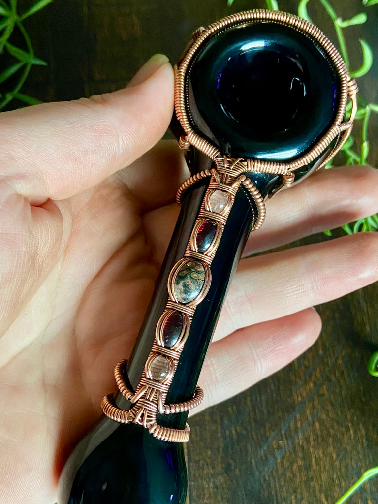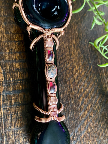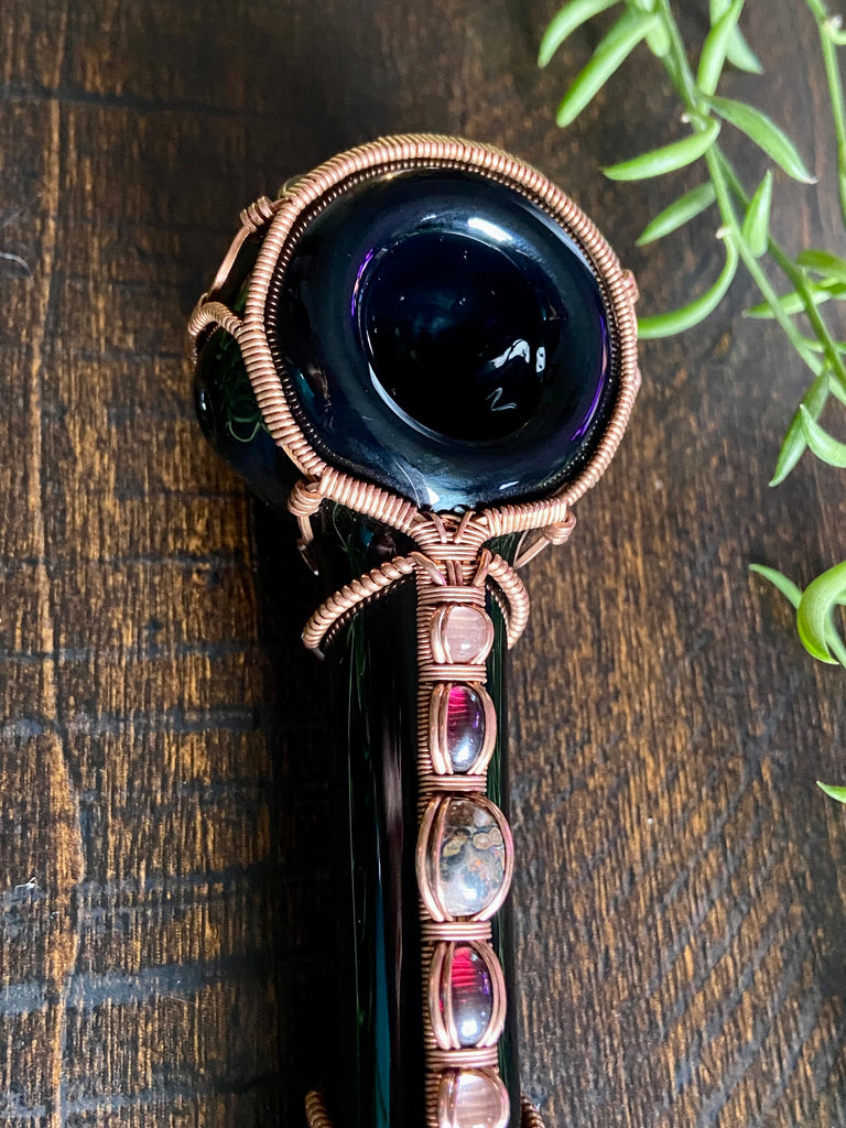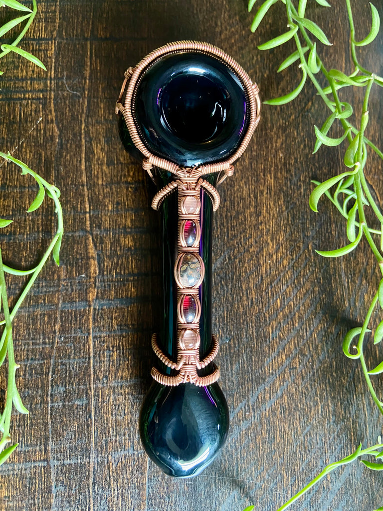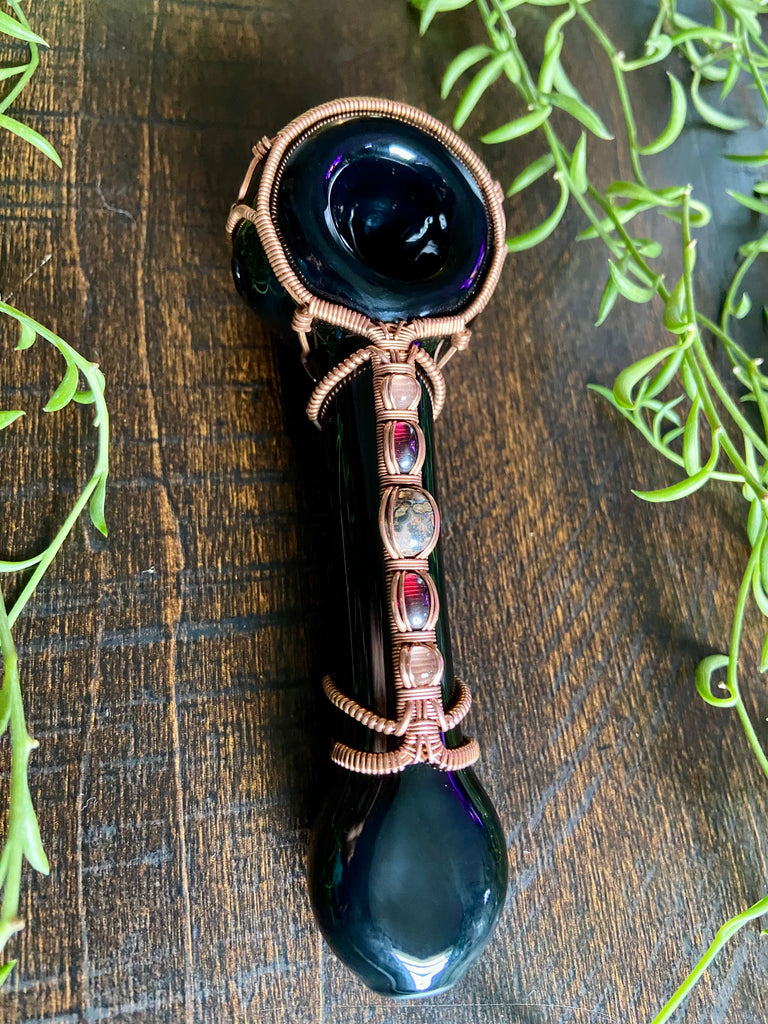 Description: Black classic style pipe wire wrapped in copper. Includes a Leopardskin jasper, two hot pink garnets and two rose quartz!