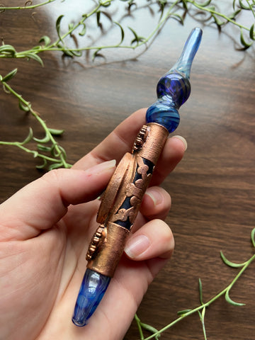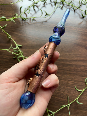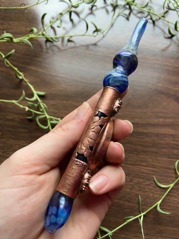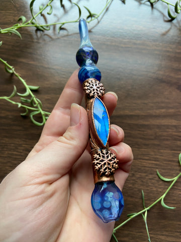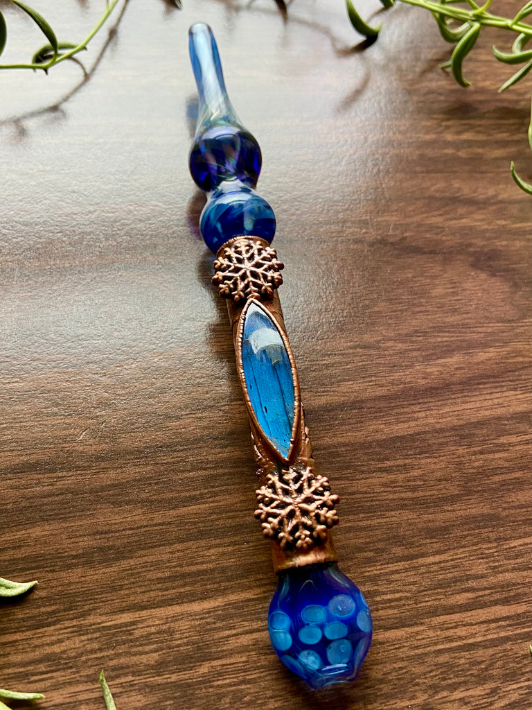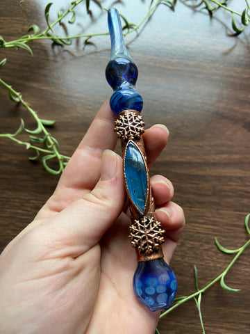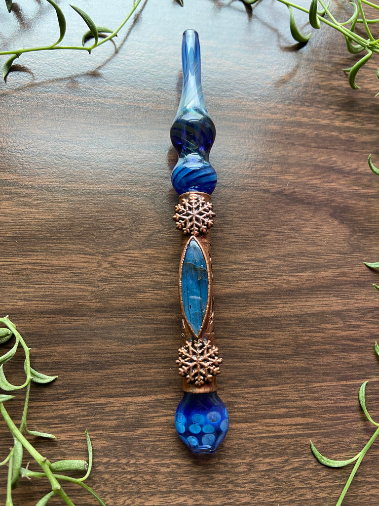6.5” borosilicate blue glass nectar collector electro formed in copper with a stunning deep blue labradorite with snowflakes on top and bottom. Finished with a patina and polish!