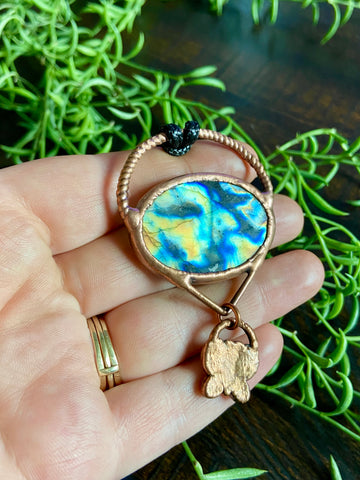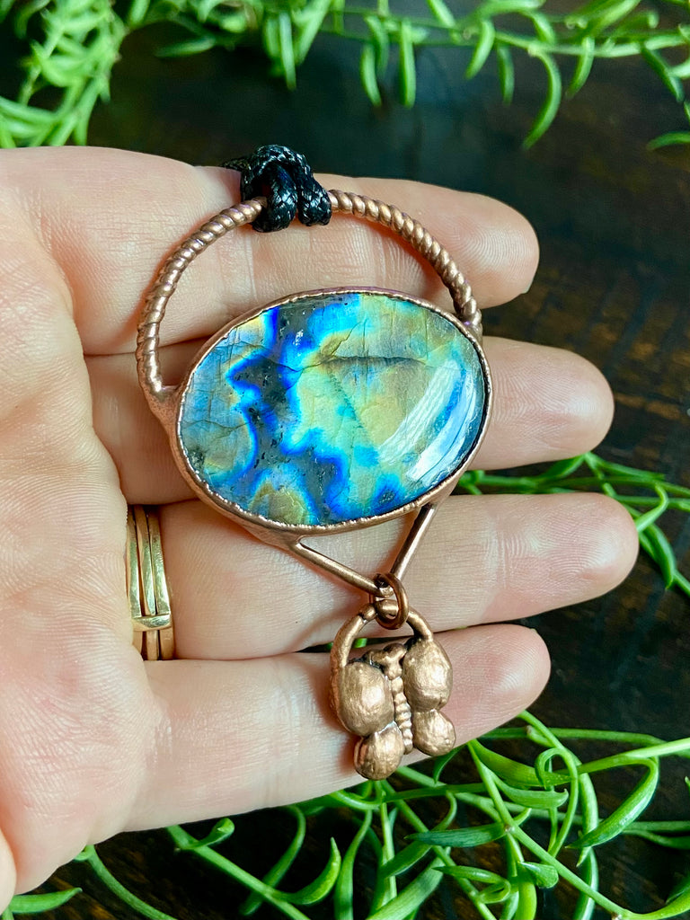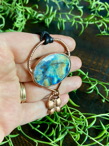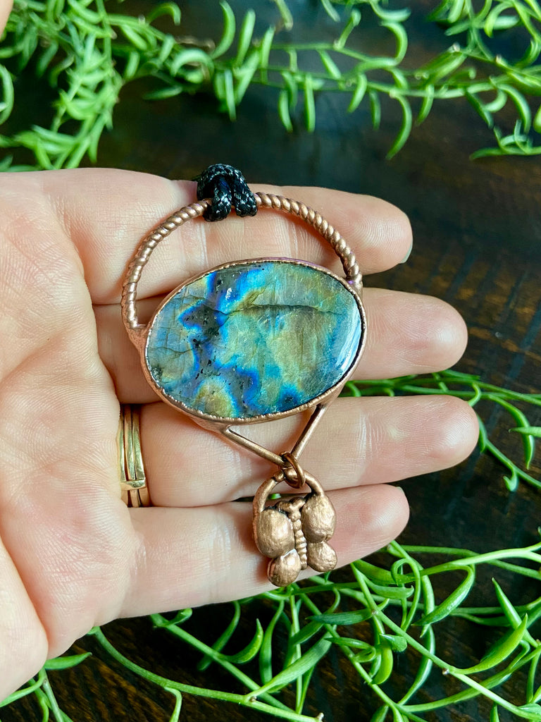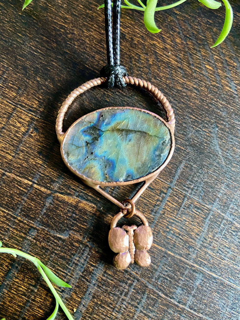 Copper electro formed labradorite pendant with a butterfly hanging off. Comes with an adjustable black rope neckalce and is finished with a patina and polish.