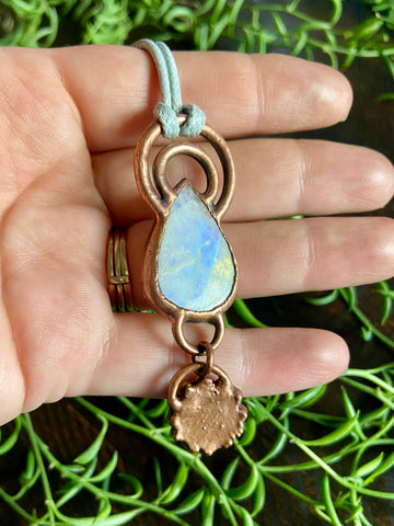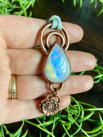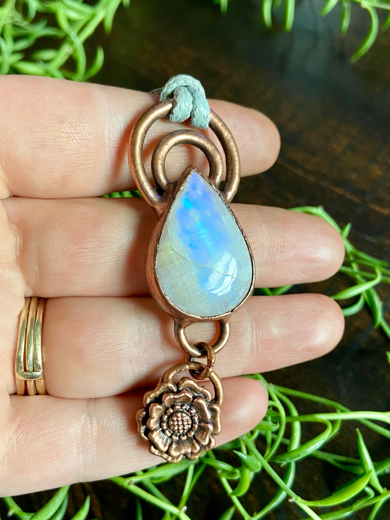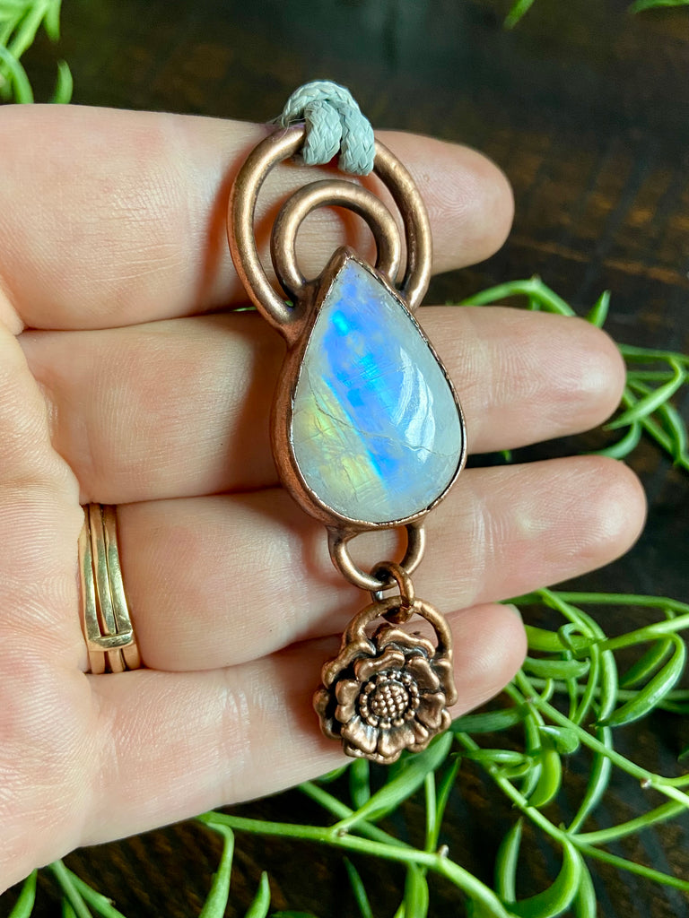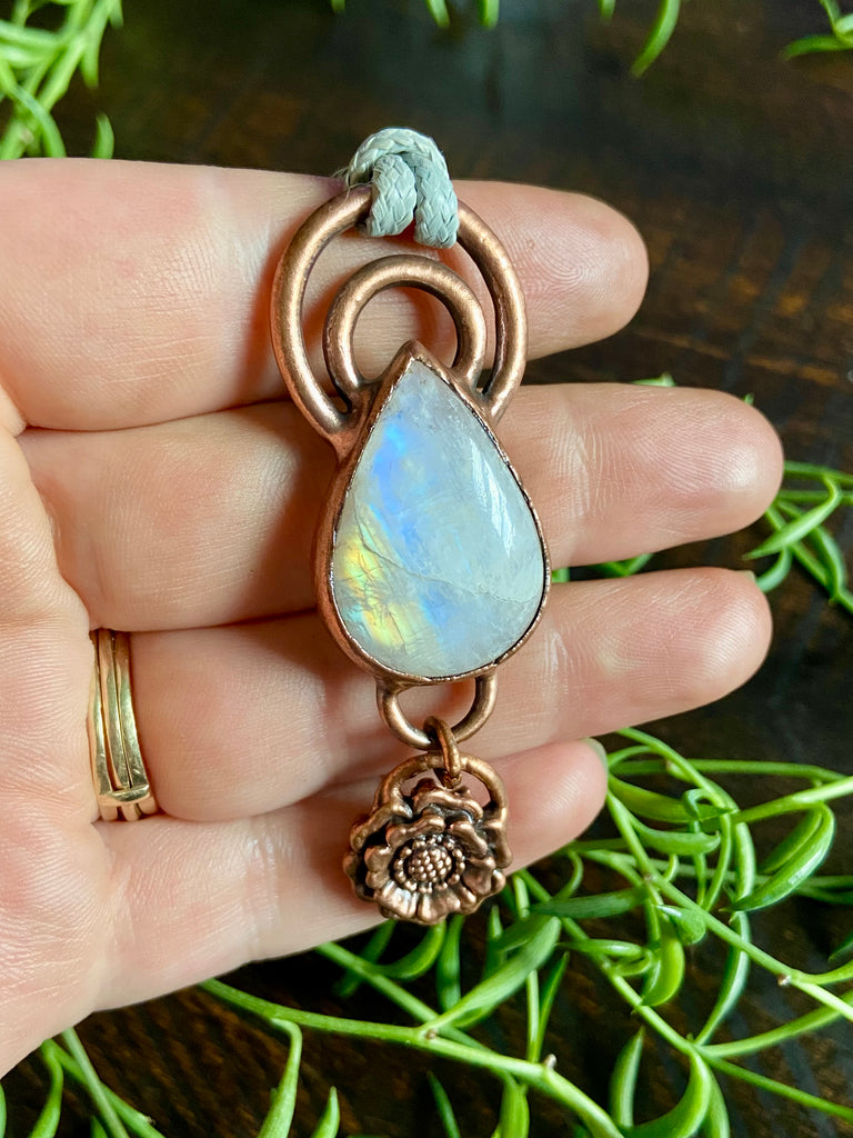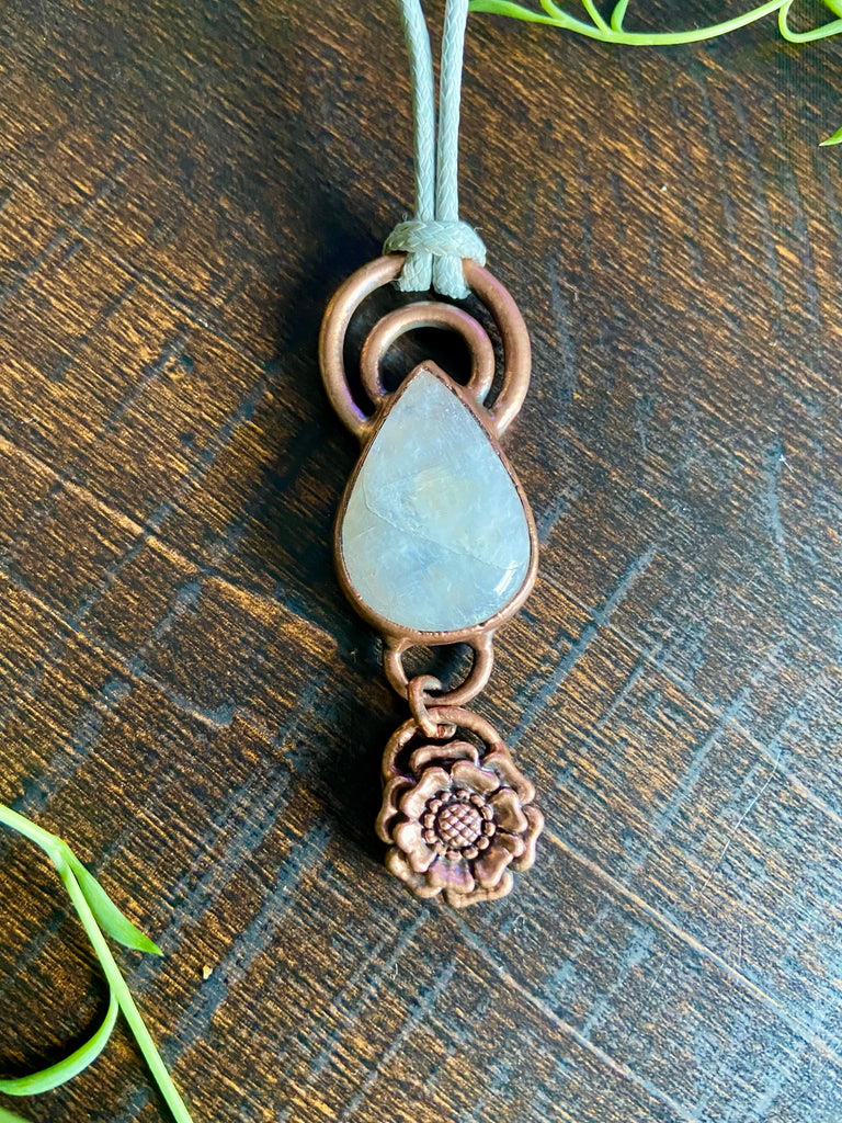 Copper electro formed moonstone pendant with a flower hanging off. Comes with an adjustable black rope neckalce and is finished with a patina and polish.