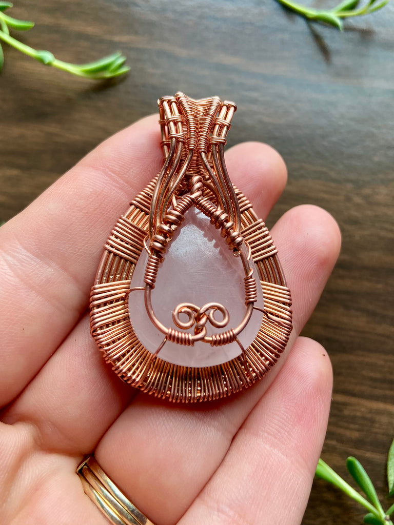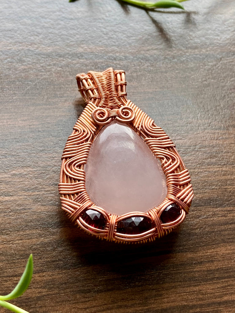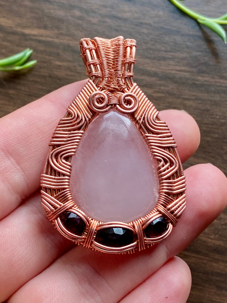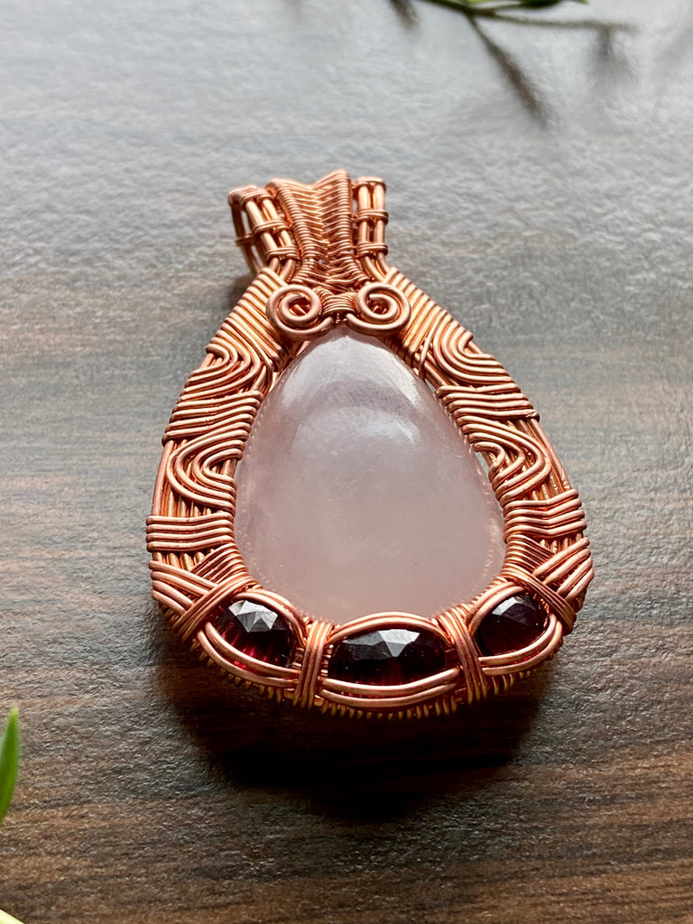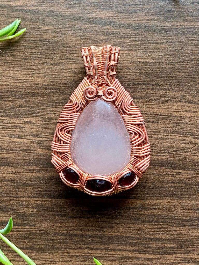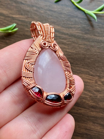 Large teardrop rose quartz wire wrapped in a trippy copper wire design with faceted hot pink garnet additions.Ā