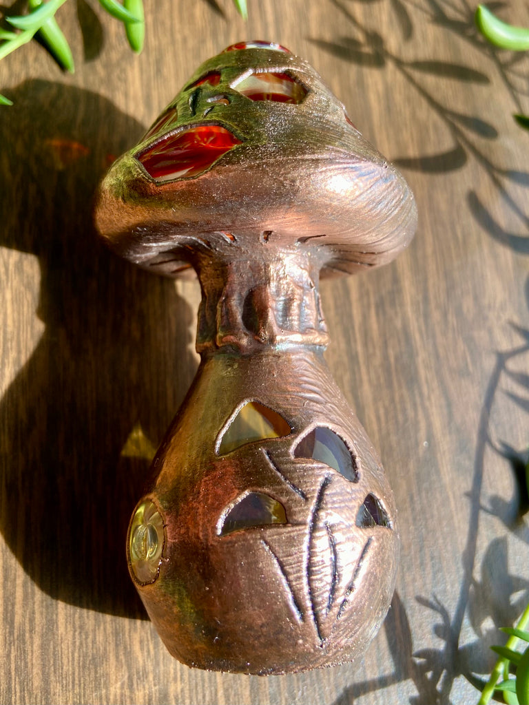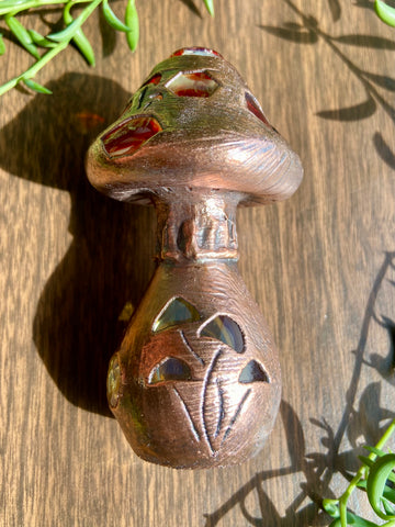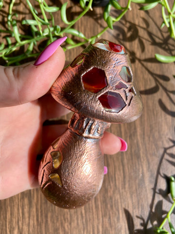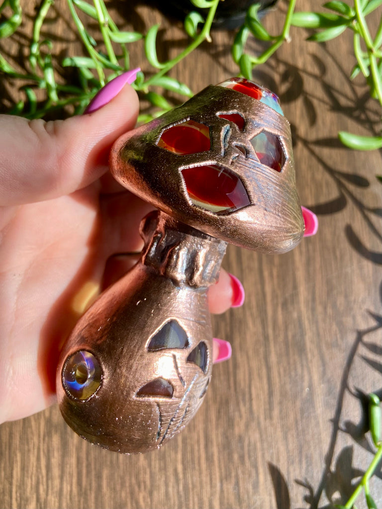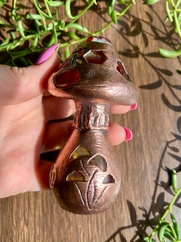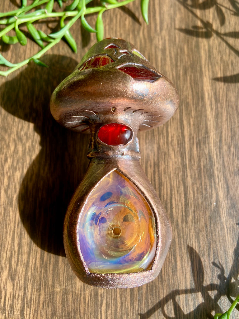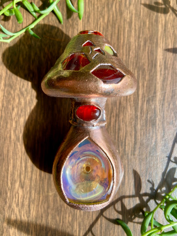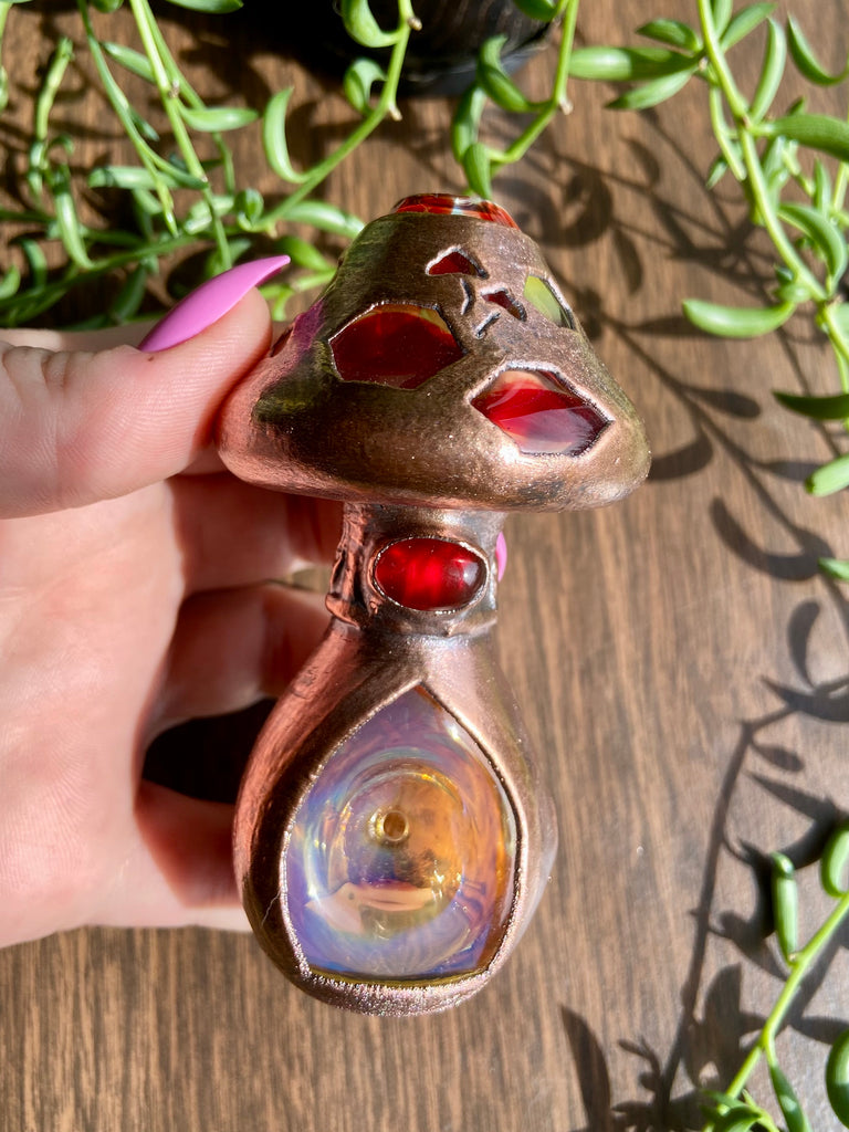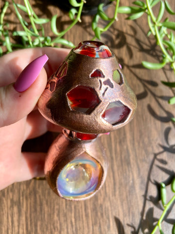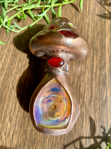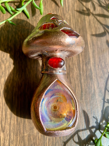 Functional four inch tall mushroom pipe, handblown in borosilicate fumed glass with red detailing. Electro formed in copper metal. Includes a red carnelian center piece with mushroom details all around!🌀
