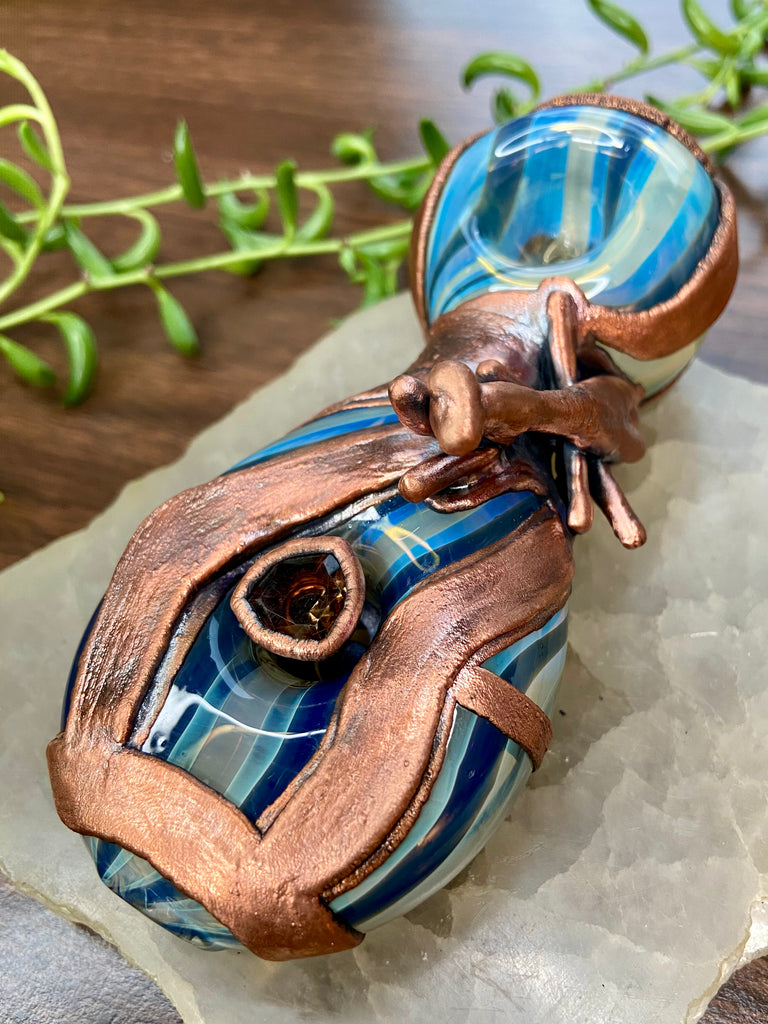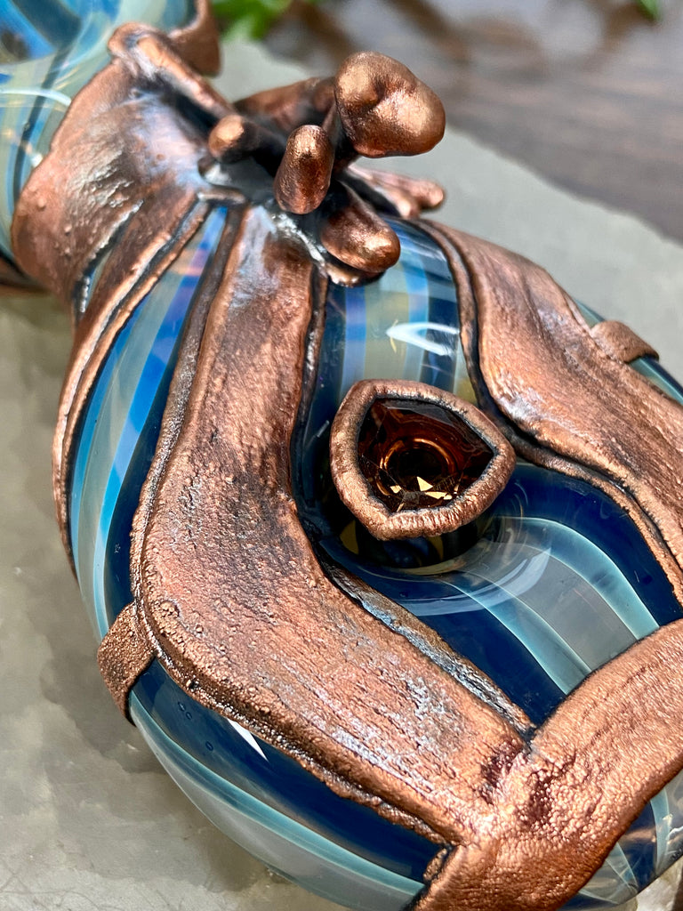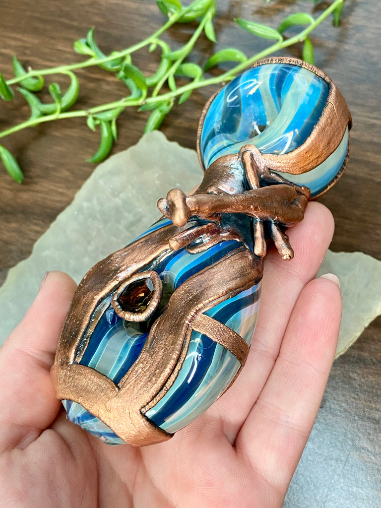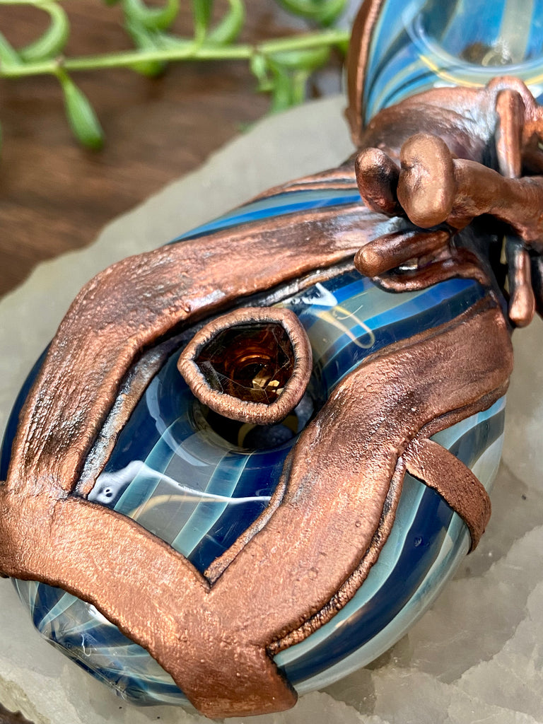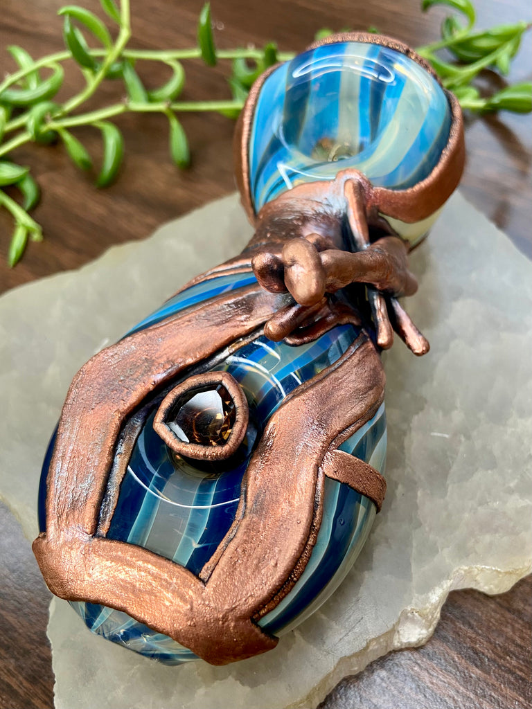 Five inch hand blown donut style borosilicate blue and fume striped glass pipe with a left sided carb. Electro formed in copper with a giant floating smoky quartz gem that is being guarded by a praying mantis. Made from a real (naturally expired) praying mantis I found at the creek. Finished with a patina and polish!
