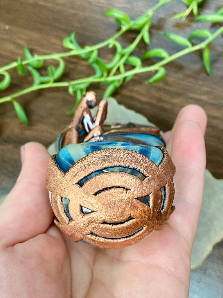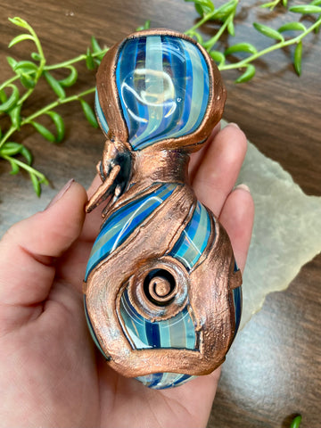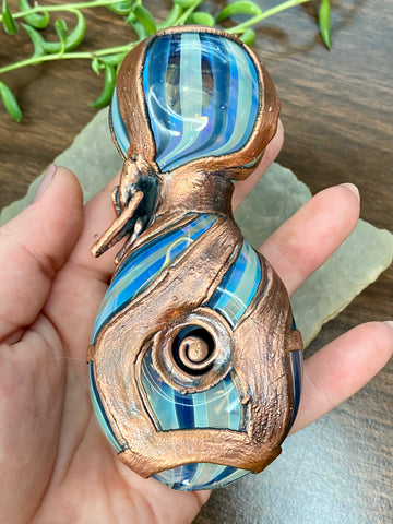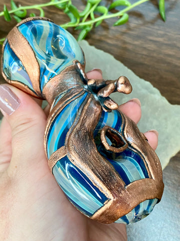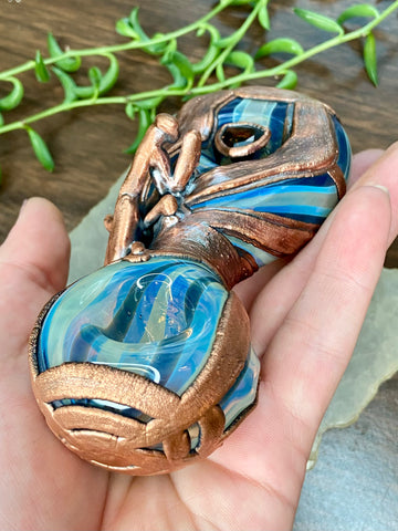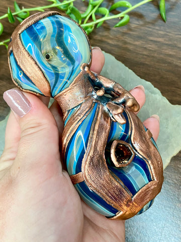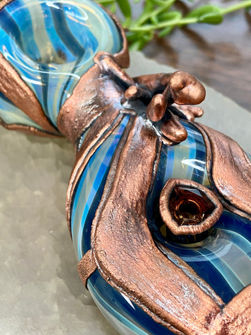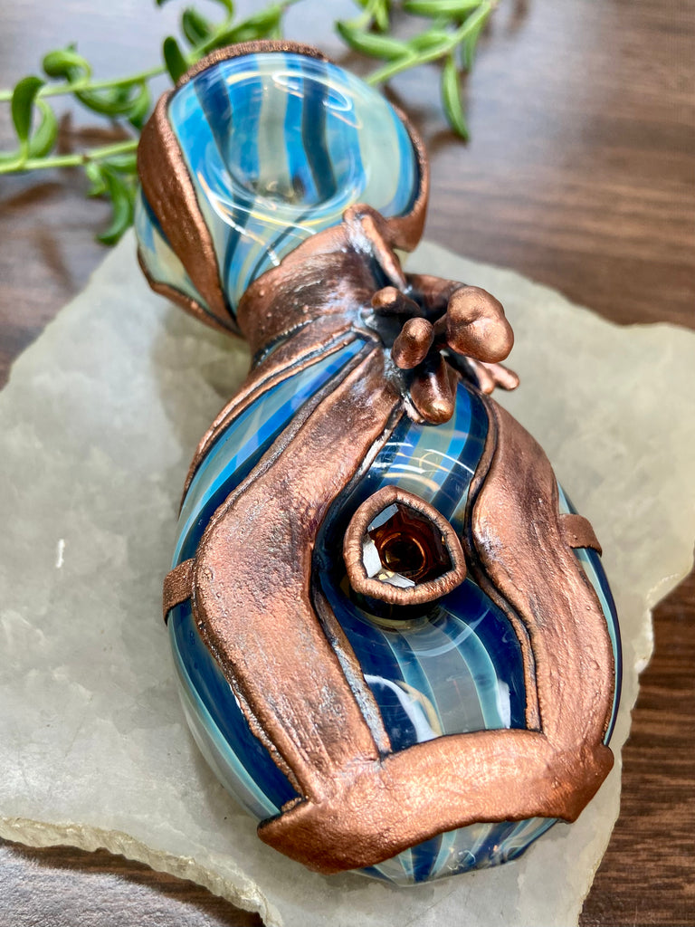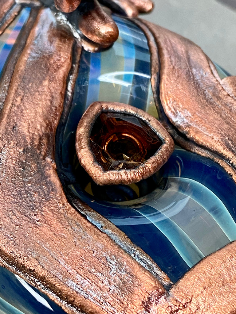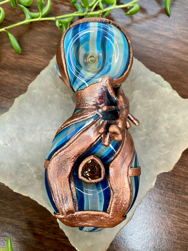 Five inch hand blown donut style borosilicate blue and fume striped glass pipe with a left sided carb. Electro formed in copper with a giant floating smoky quartz gem that is being guarded by a praying mantis. Made from a real (naturally expired) praying mantis I found at the creek. Finished with a patina and polish!