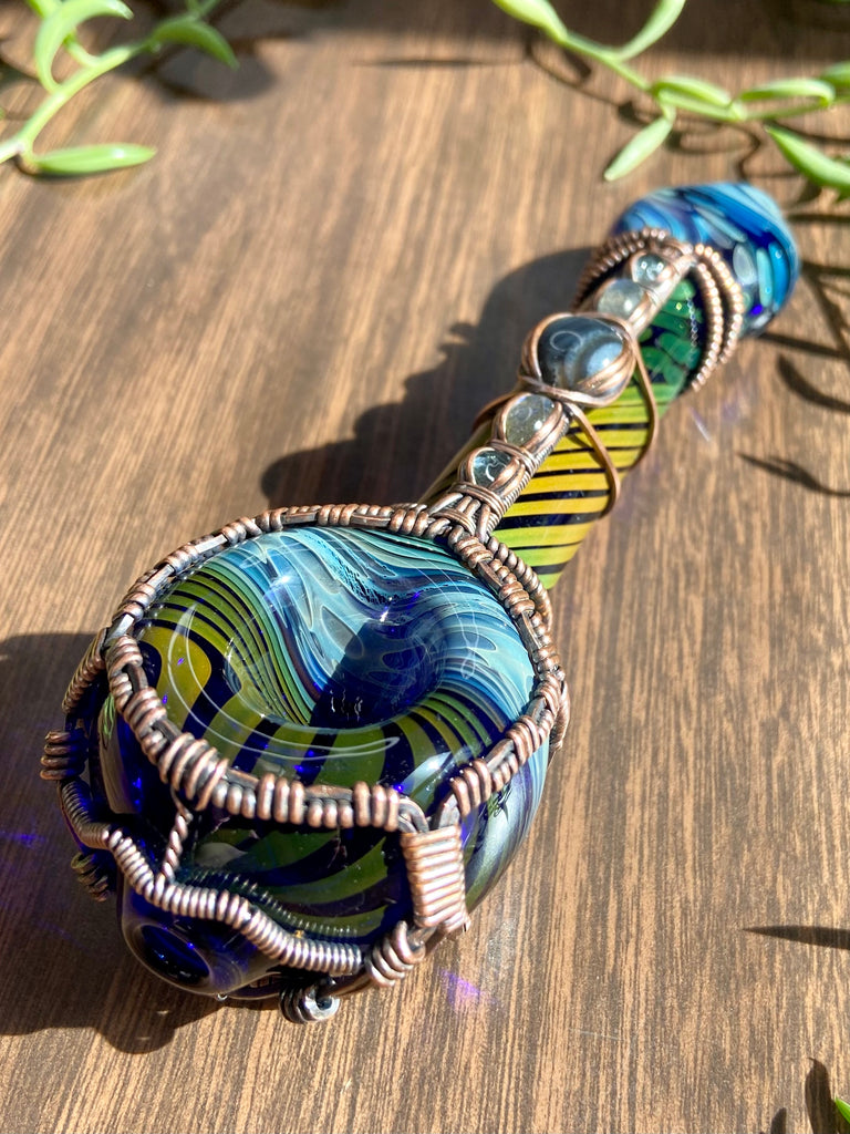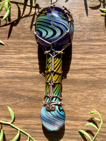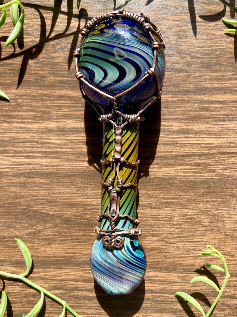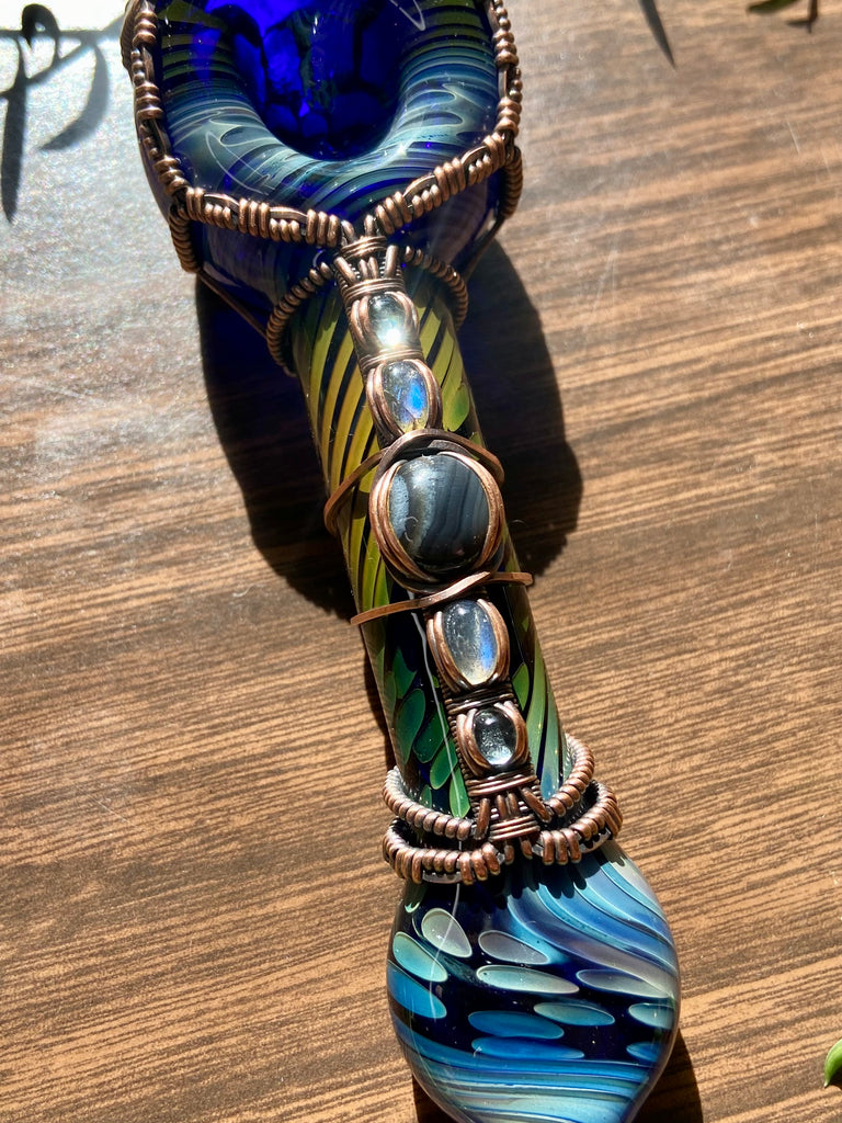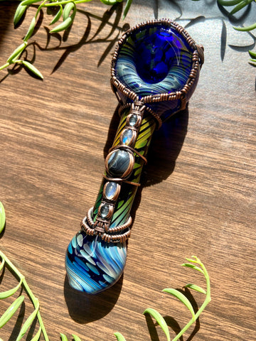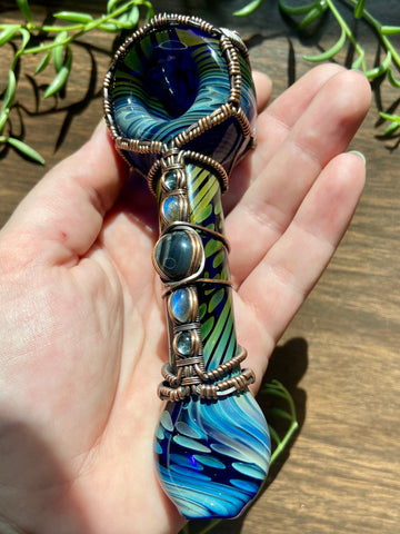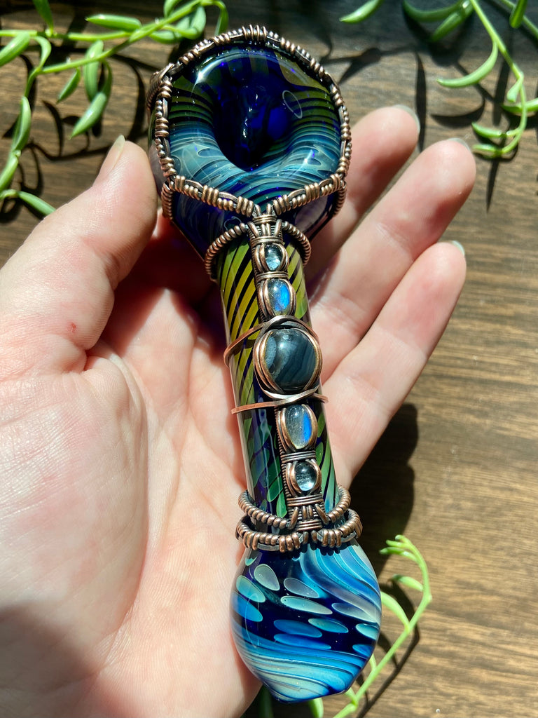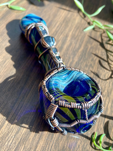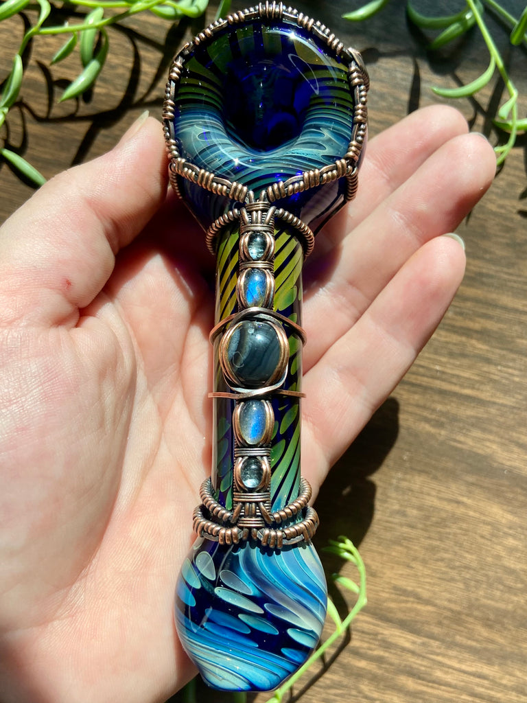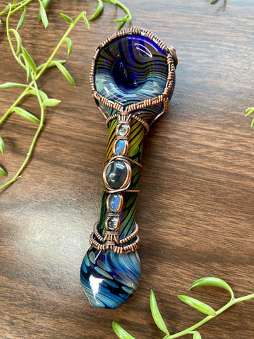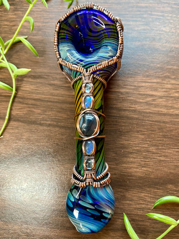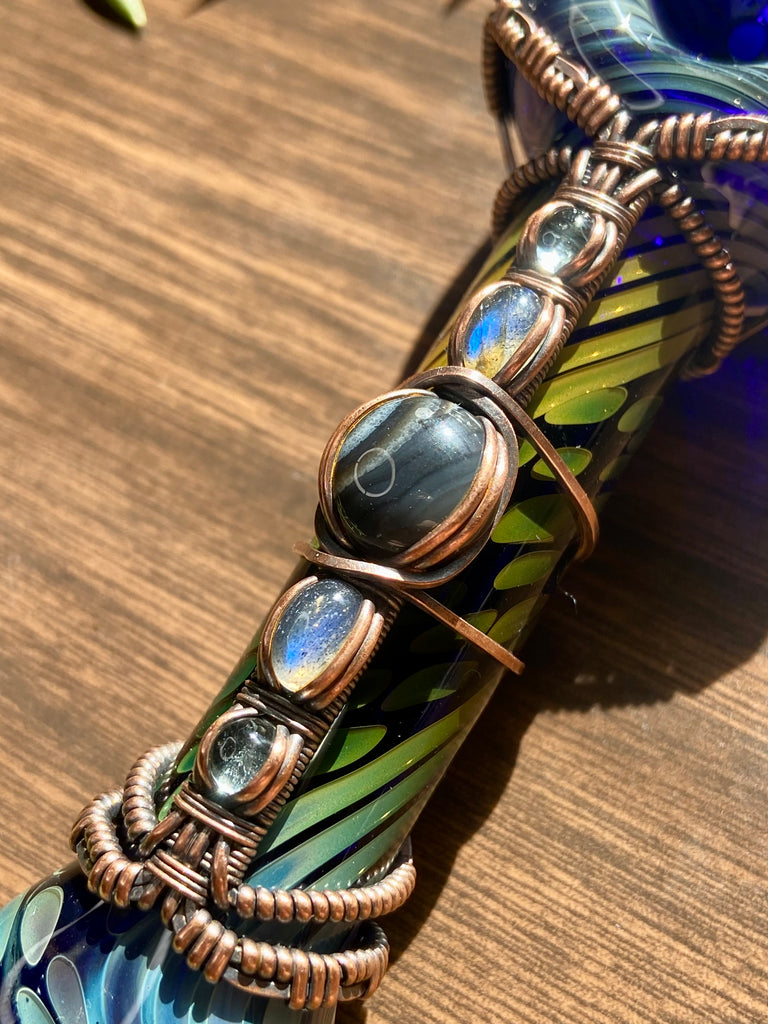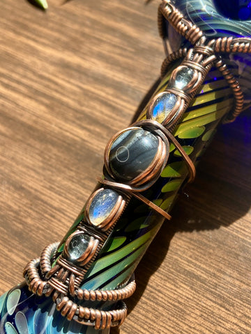 Description: Blue rainbow fumed classic style pipe wire wrapped in copper and finished with a patina and polish. Includes a blue agate center piece, two blue flash labradorite and two blue topaz gems!