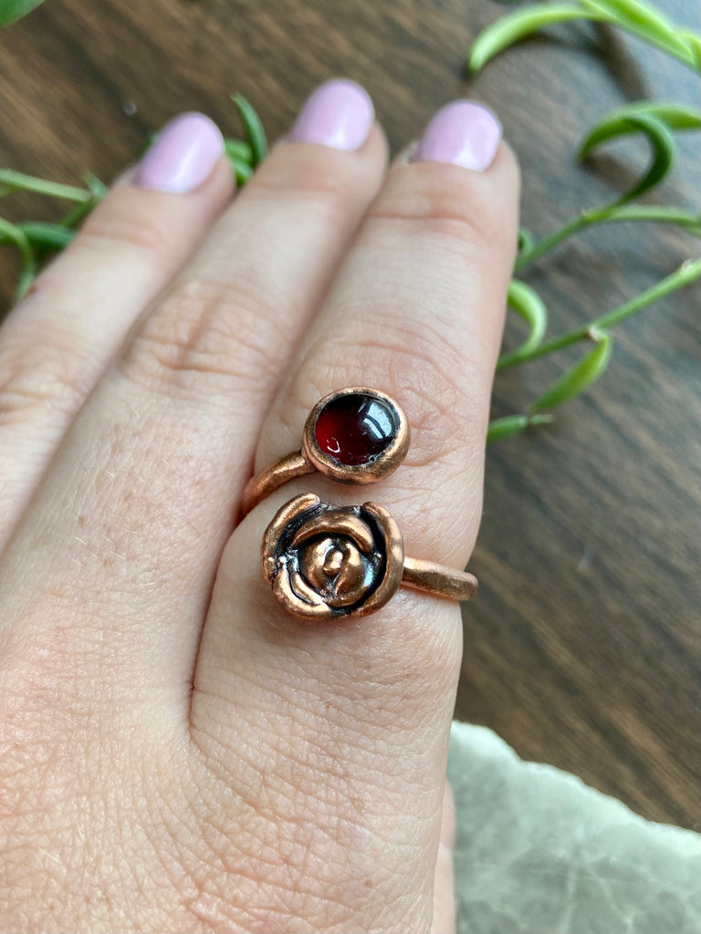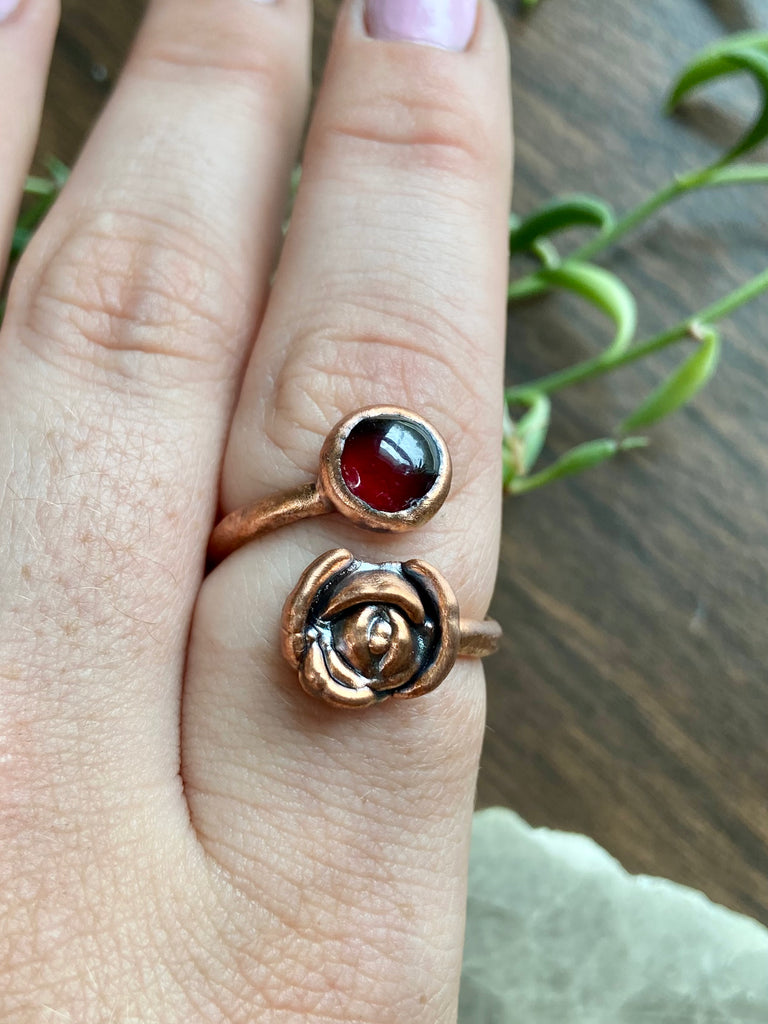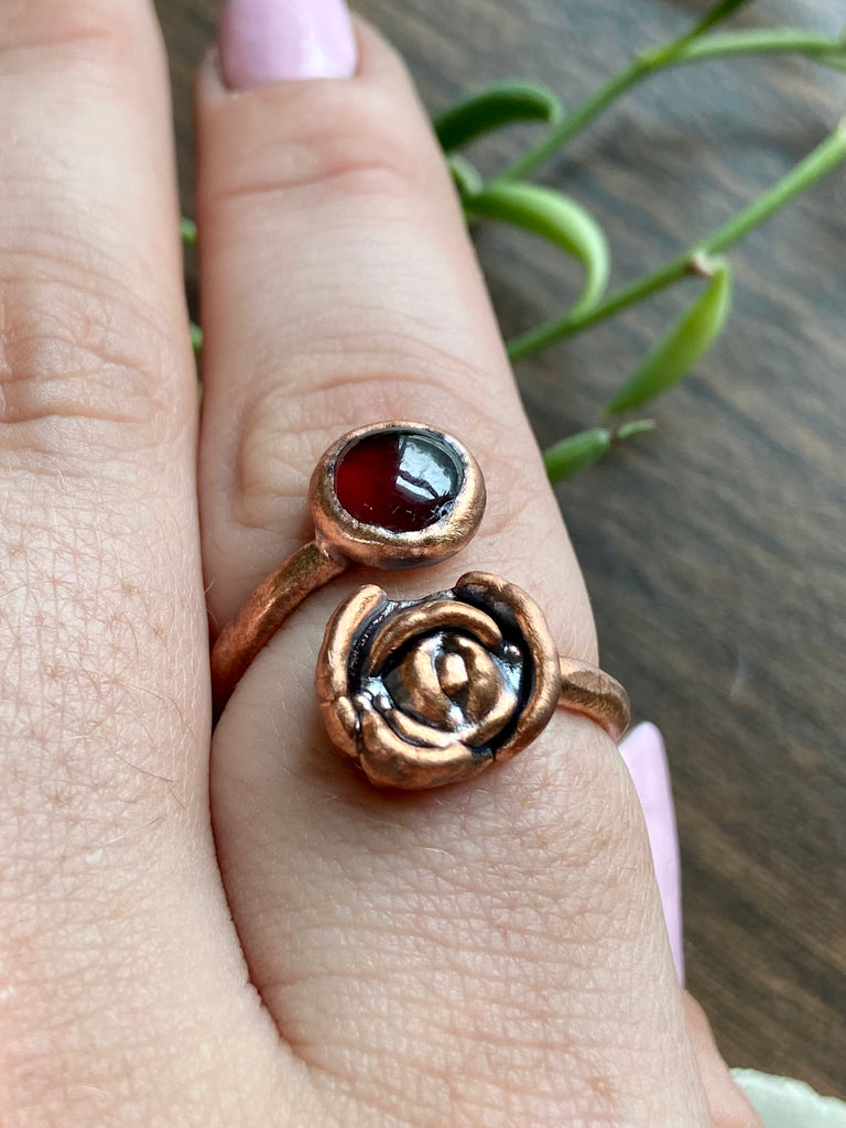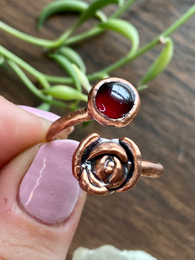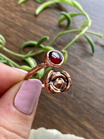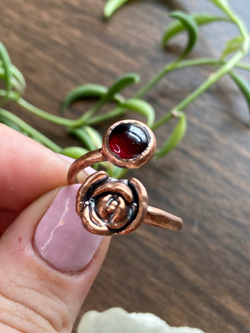 Handmade copper electro formed ring with a round hot pink garnet and a rose.