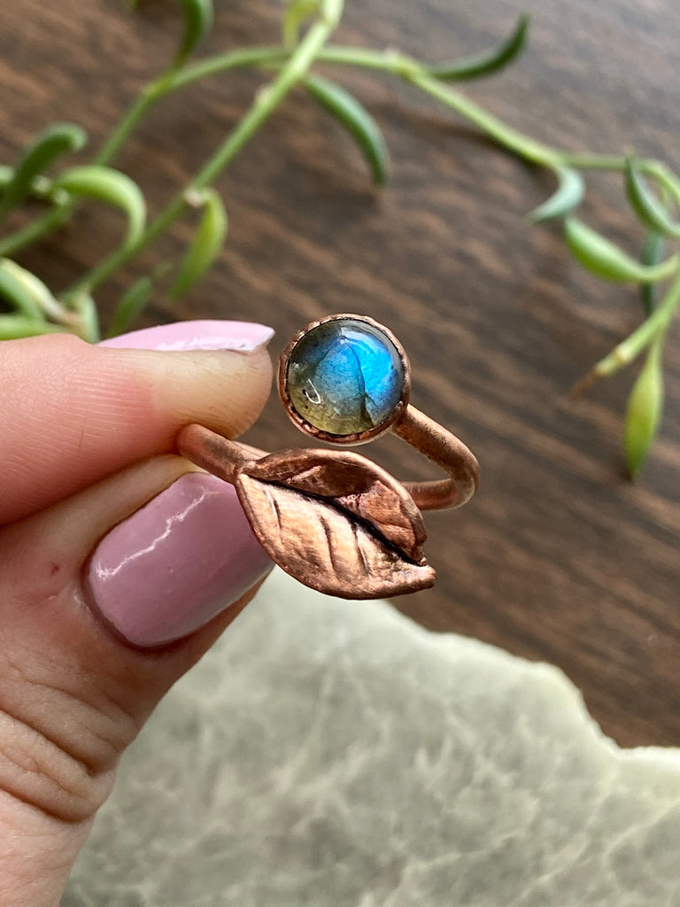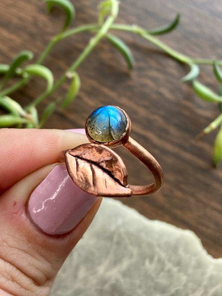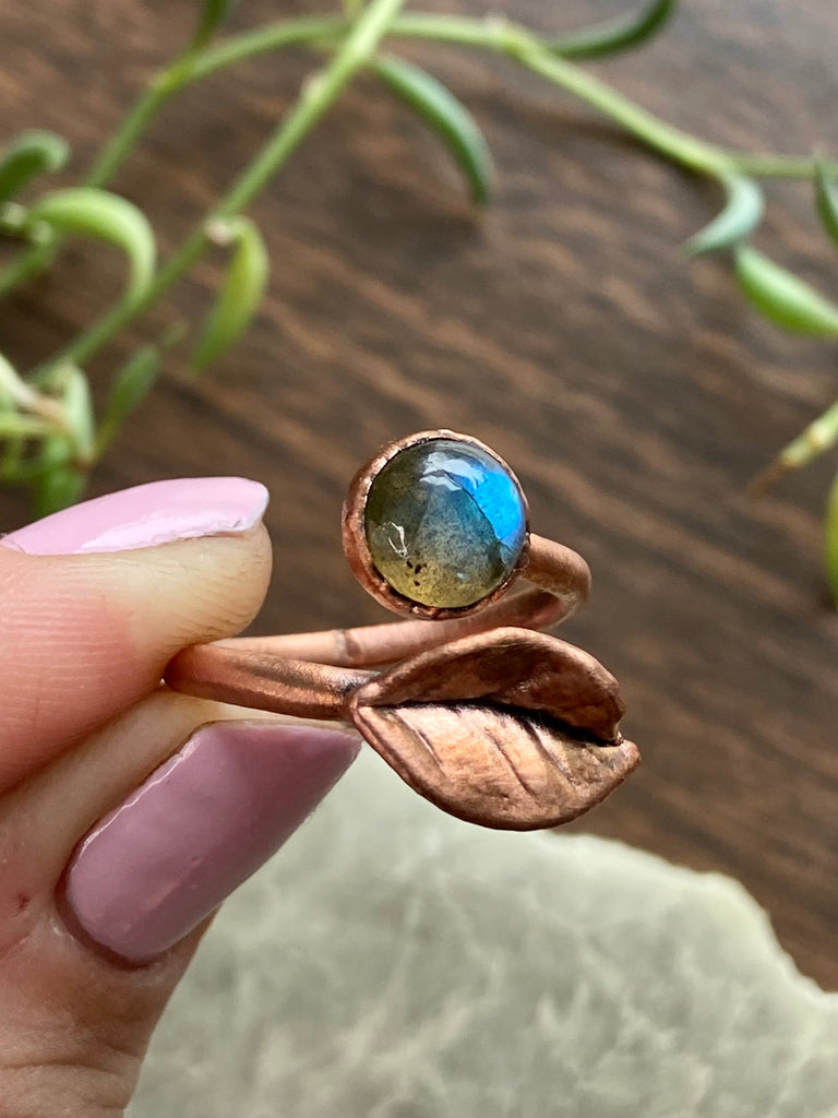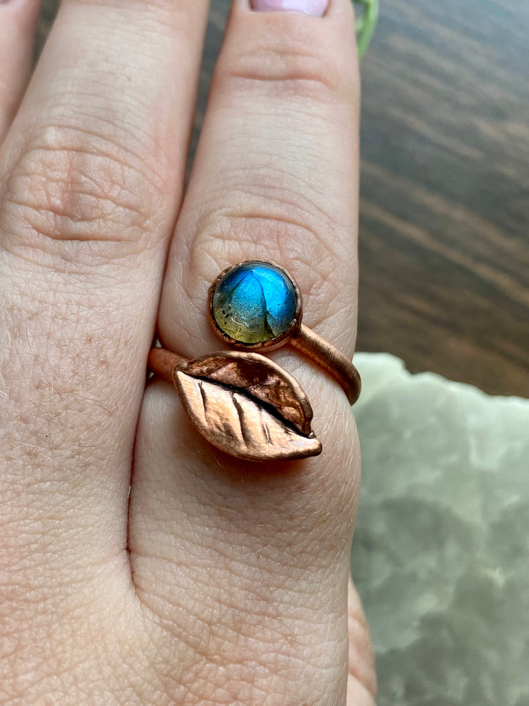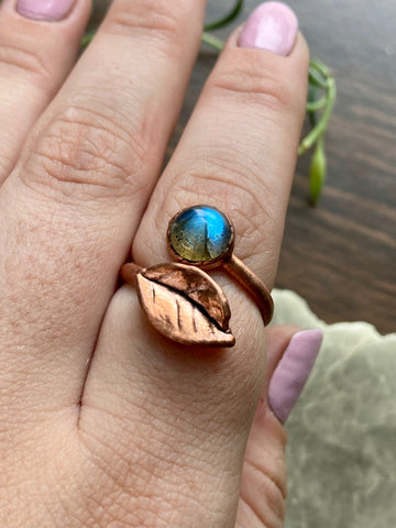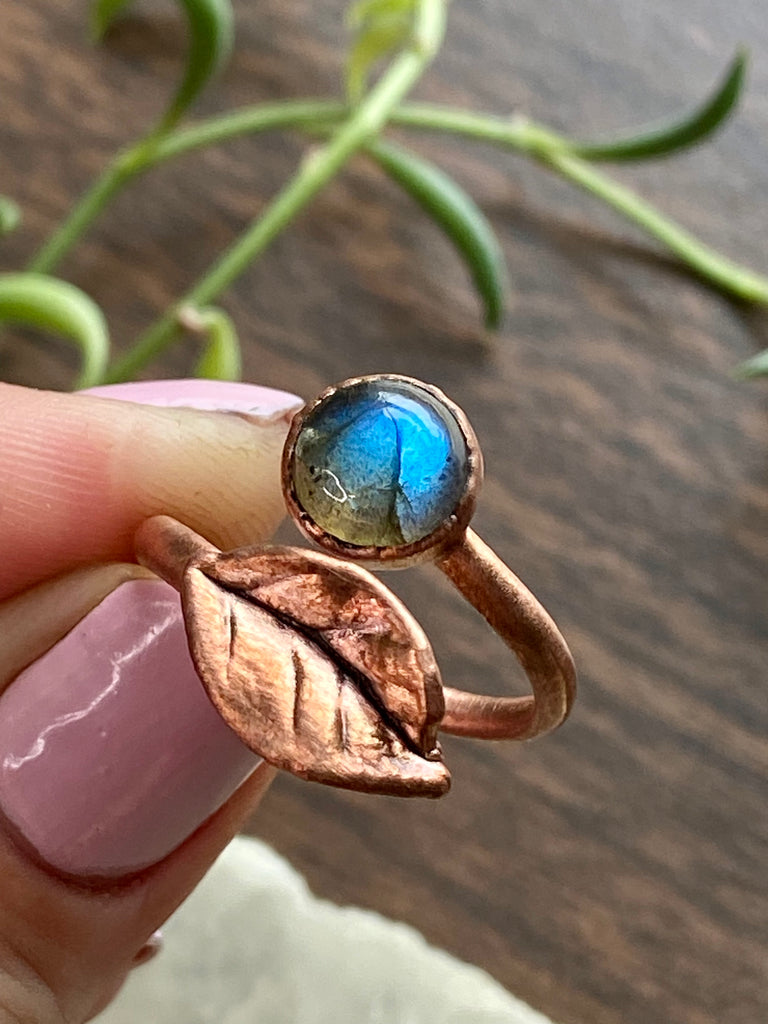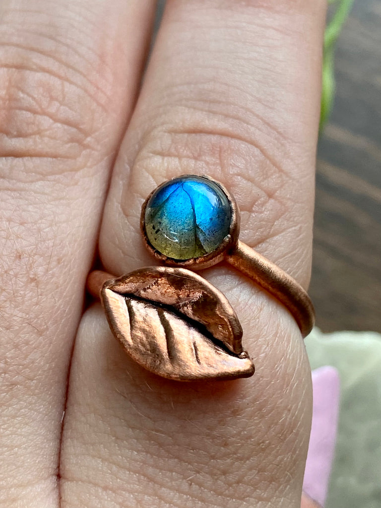 Handmade copper electro formed ring with an flashy blue labradorite and a leaf.