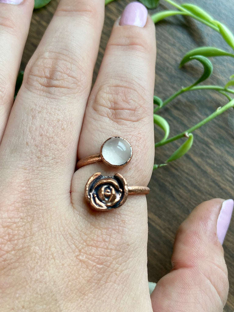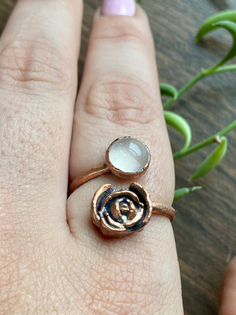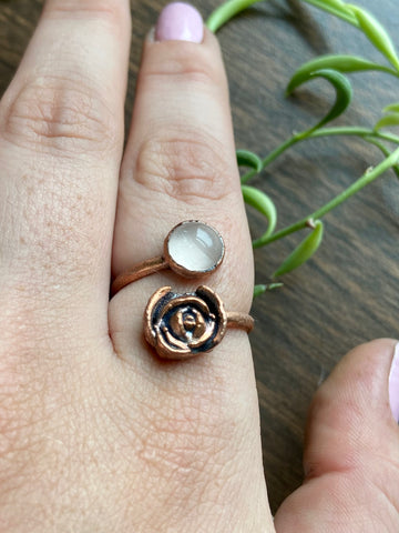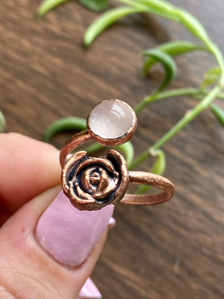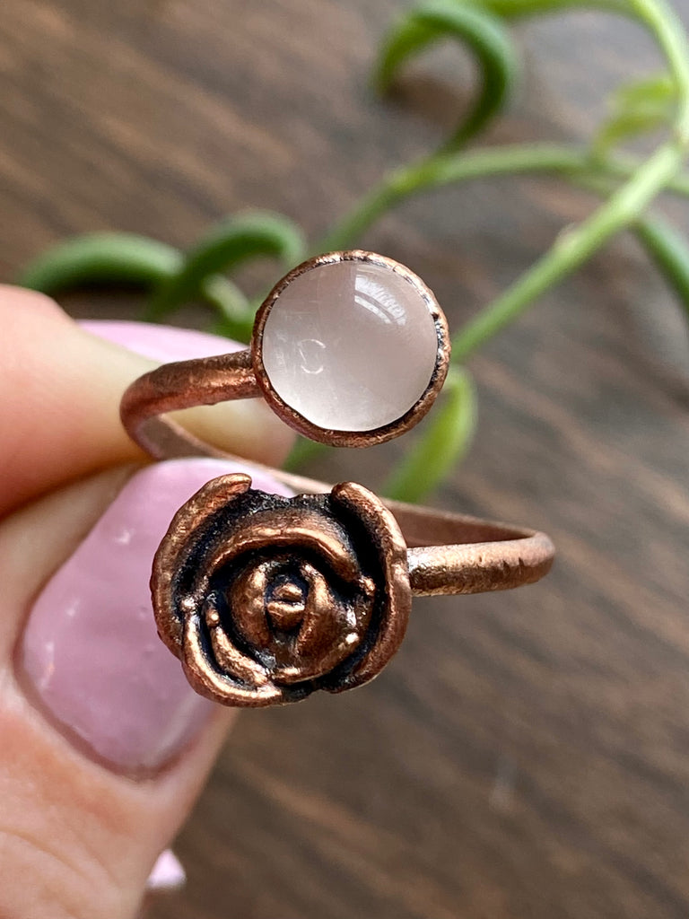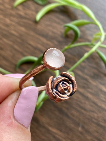 Handmade copper electro formed ring with a round pink rose Quartz and a rose.