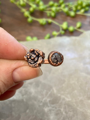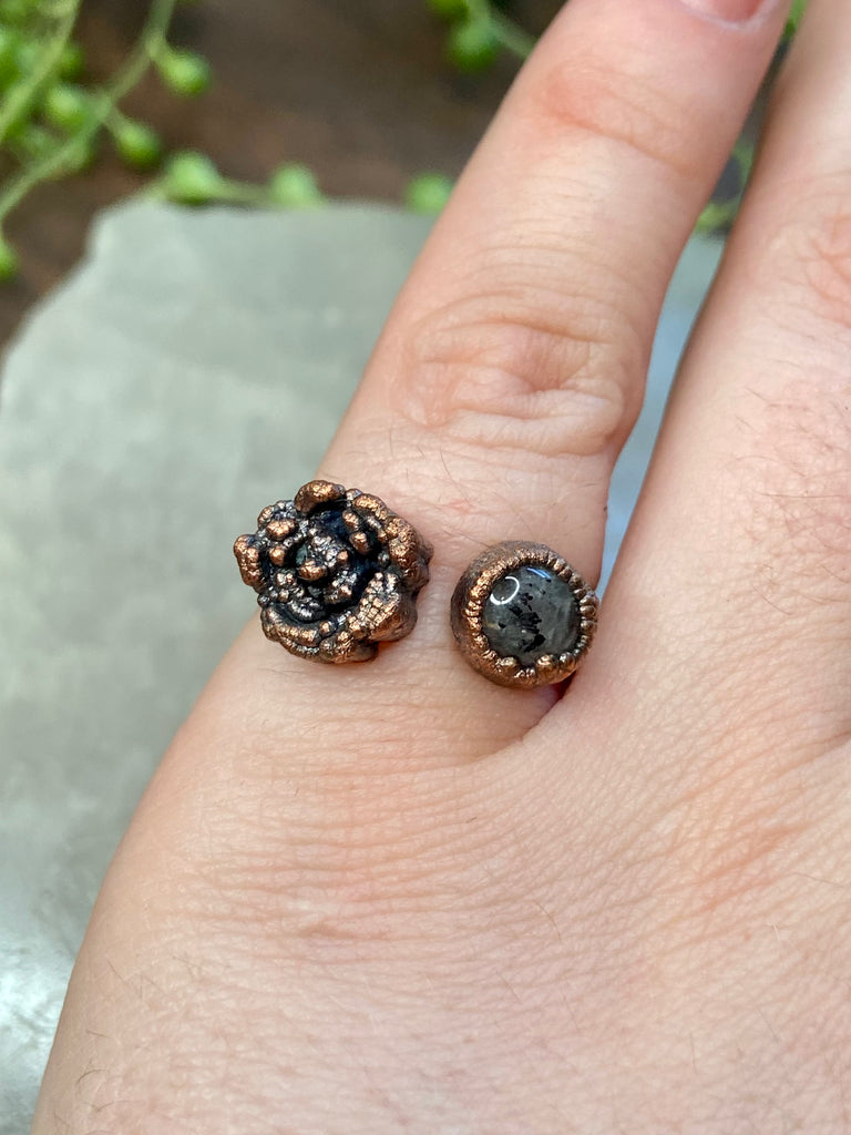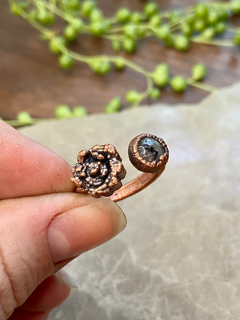 Completely handmade copper electro formed ring with a tourmilated Quartz and a rose.