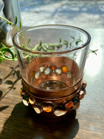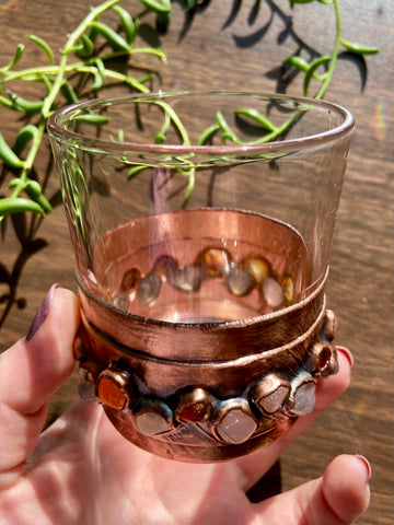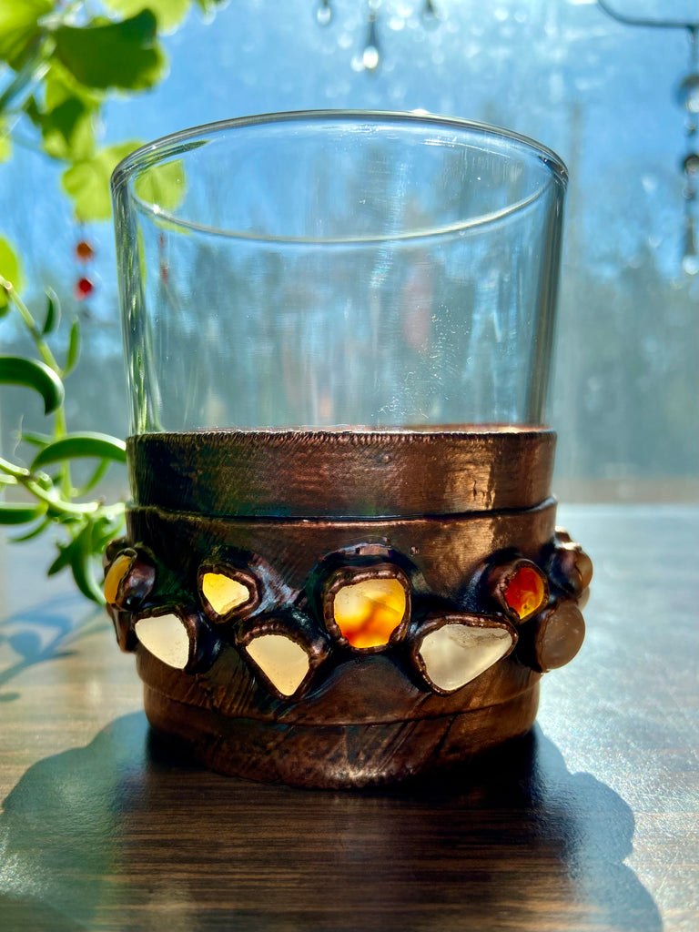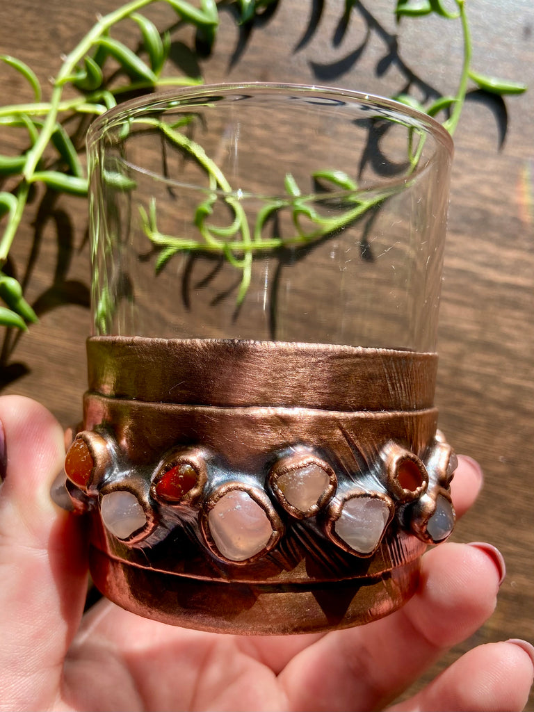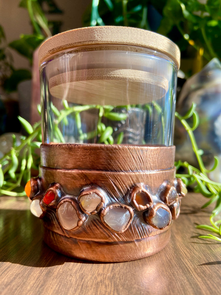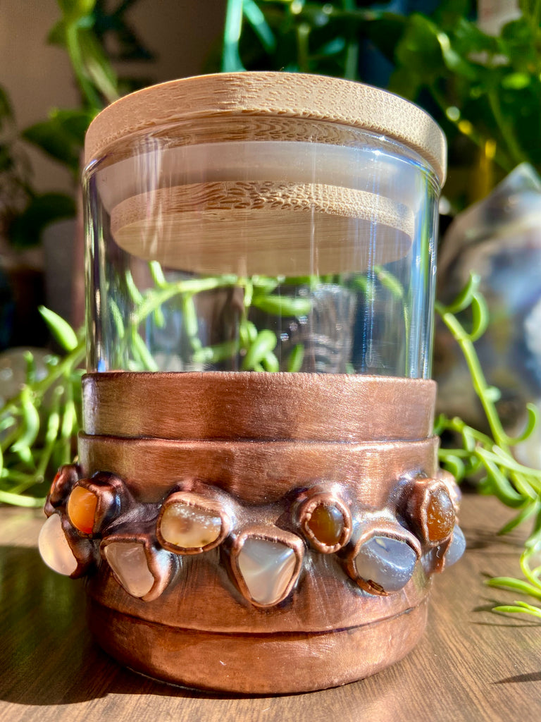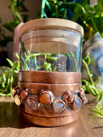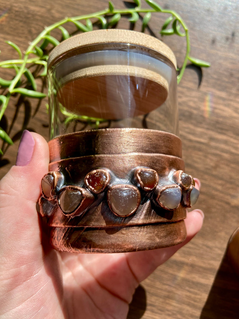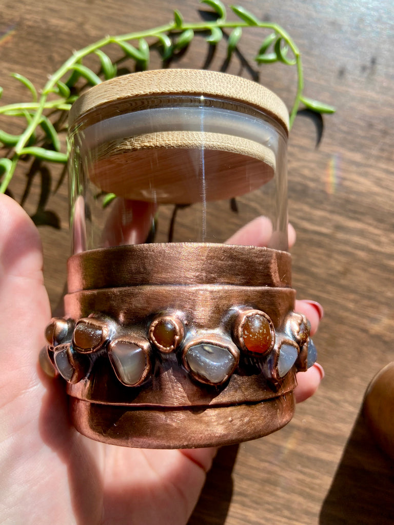 Copper electro formed glass jar with a wooden suction lid. Features genuine red and grey agate chunks surrounding the whole jar. Finished with a patina and polish. Comfortably fits up to a half ounce of dry herbs. Would also make for a beautiful scotch on the rocks cup!