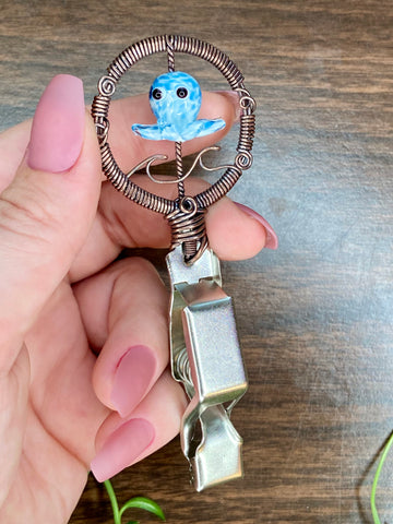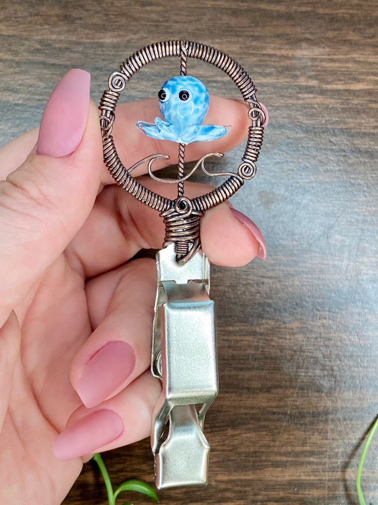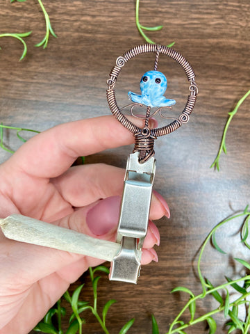 Features a blue glass octopus bead that spins and keeps your fingers busy between joints. Fits fattys and darts with ease! Clip is made from stainless steel and the copper wrap is finished with a patina and polish.