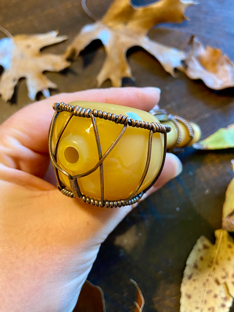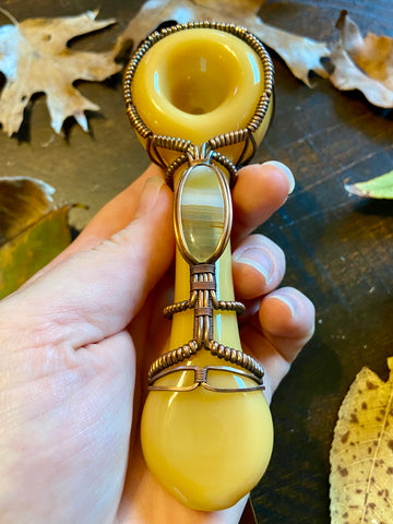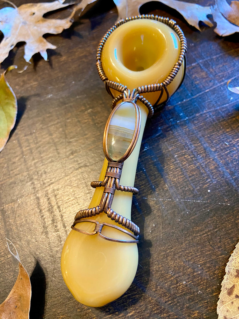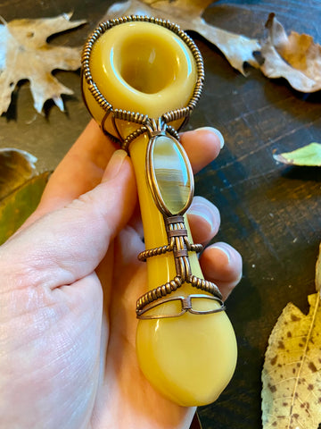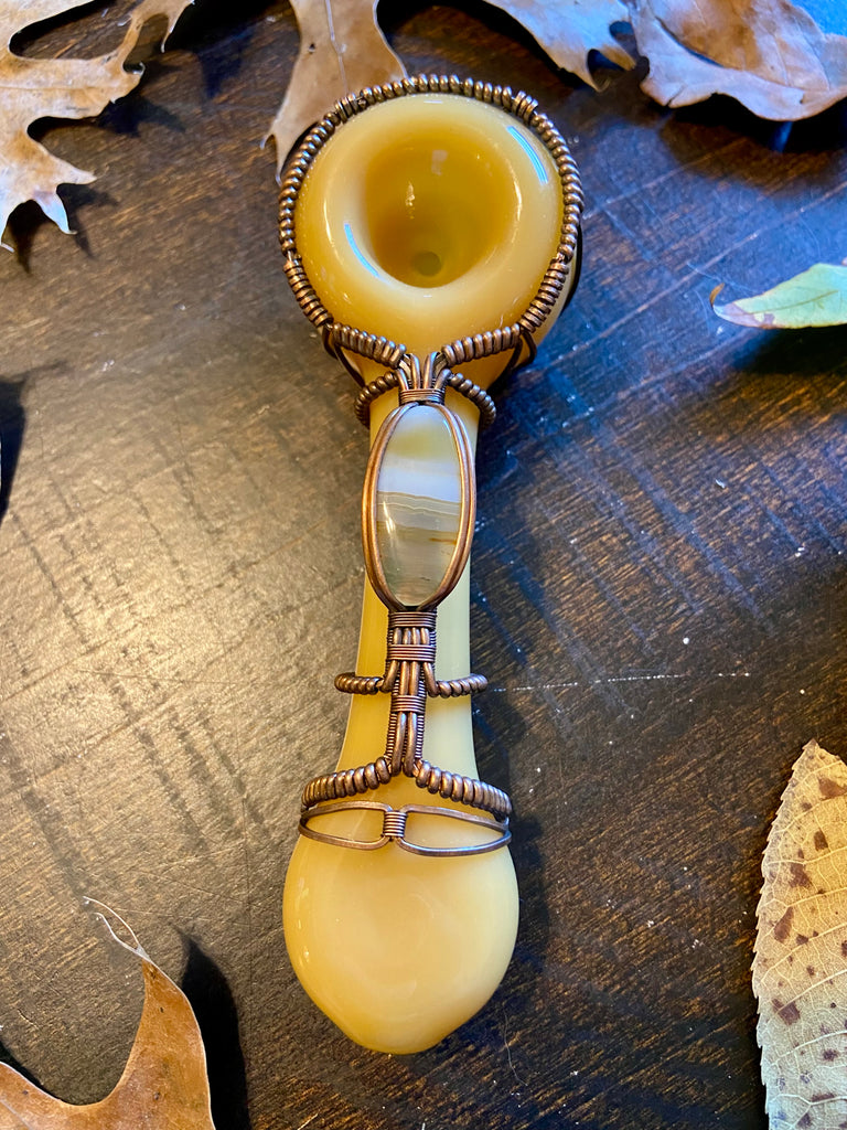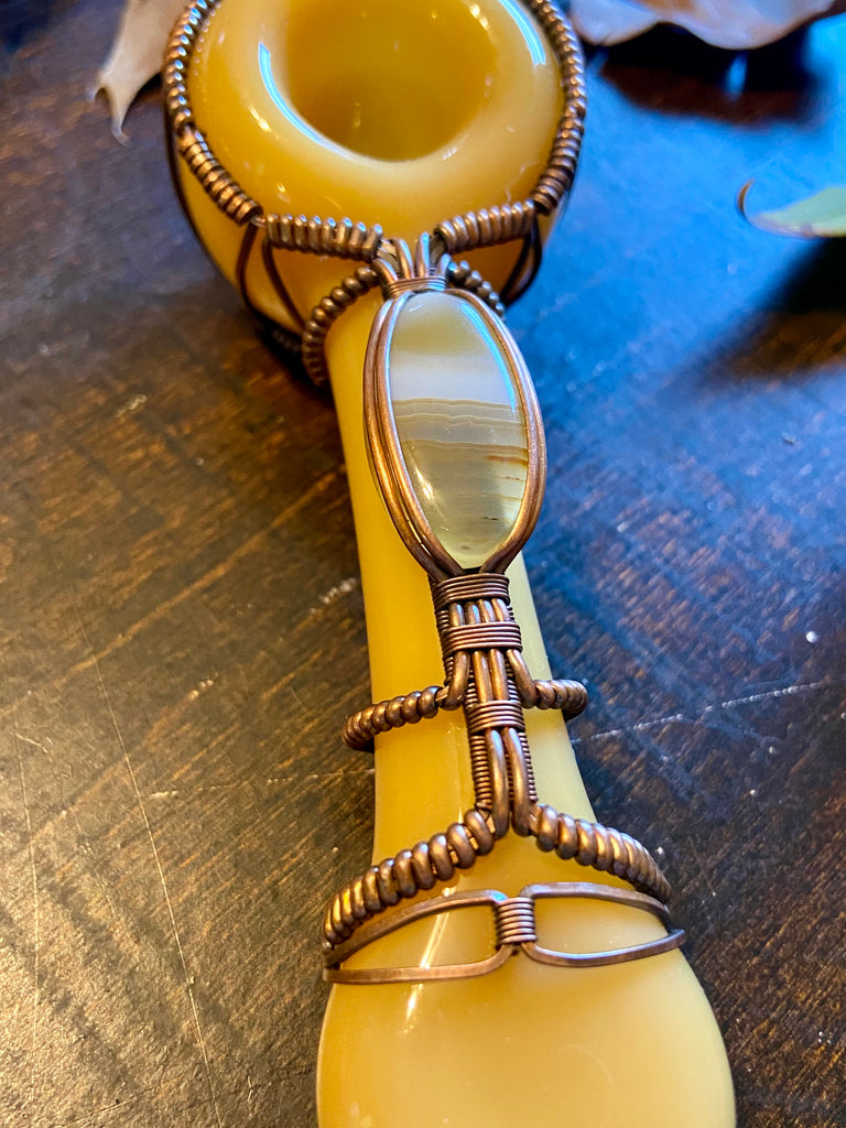 Description: Pastel yellow/orange classic style pipe wire wrapped in copper. Includes a yellow Botswana lace agate!