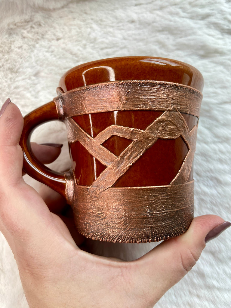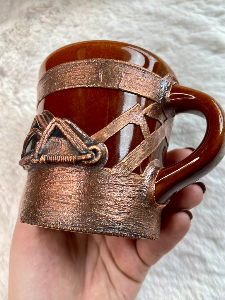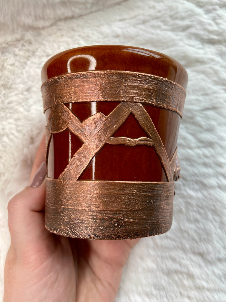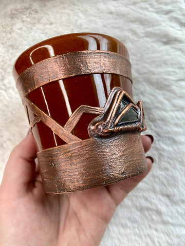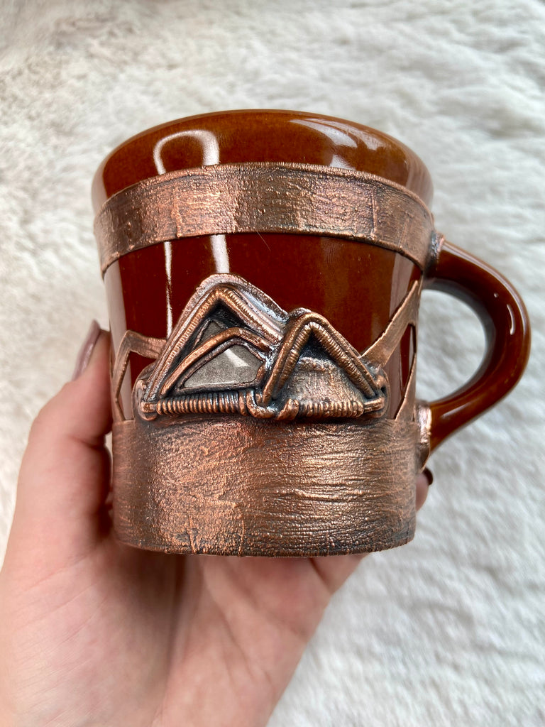 Rustic mountain range coffee cup electro formed in copper and finished with a patina and polish. Includes silver sheen obsidian. Hand wash and dry.