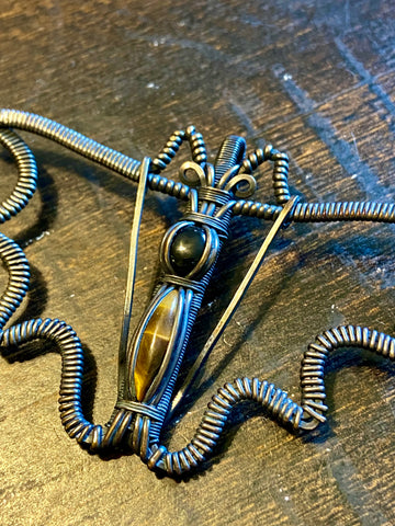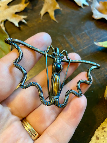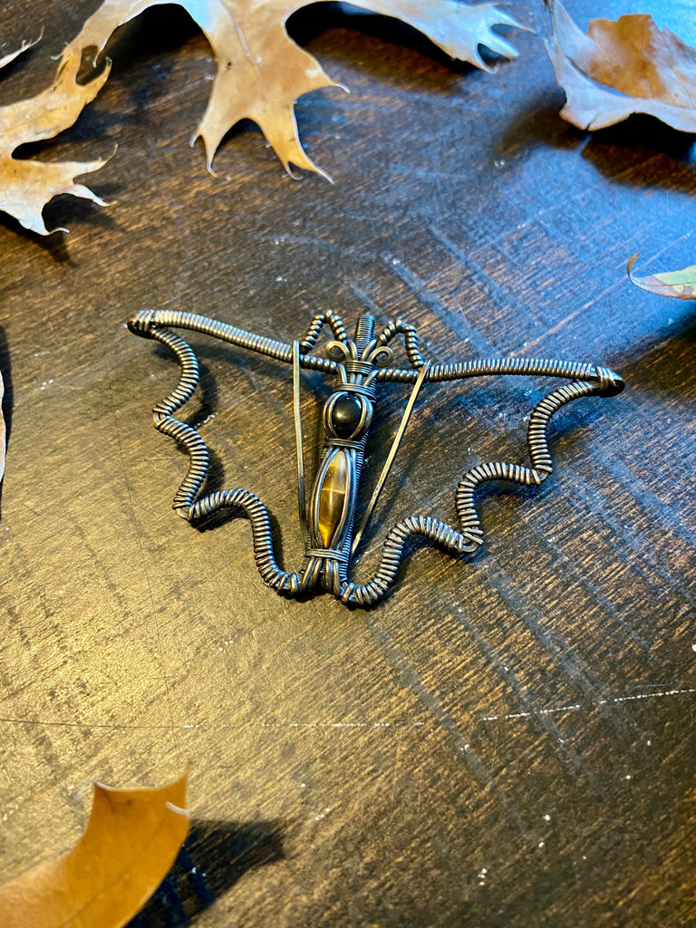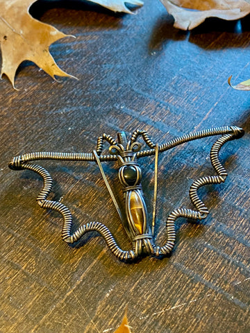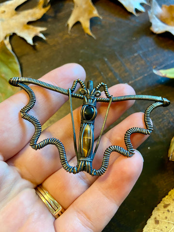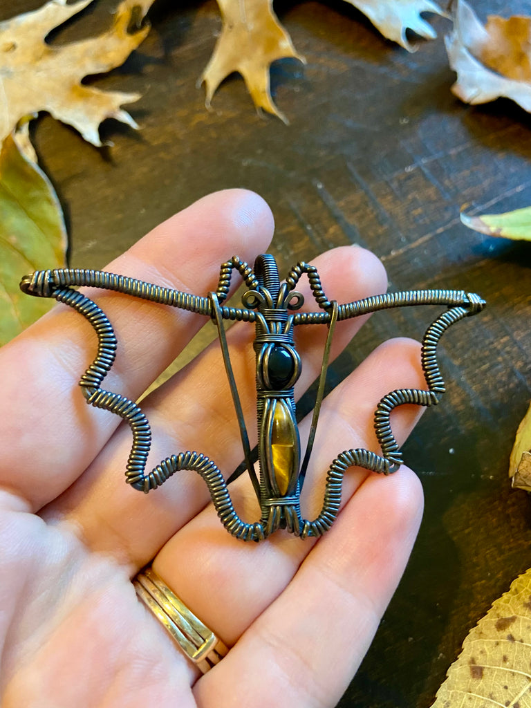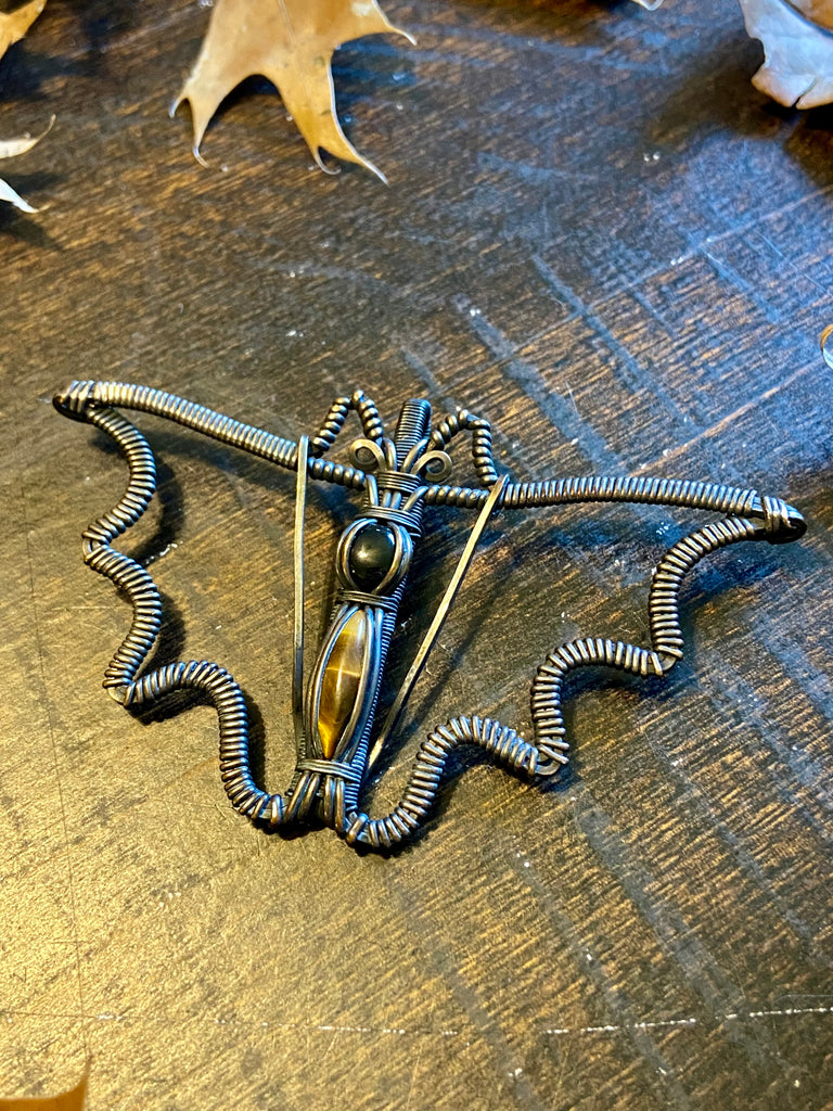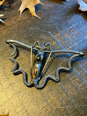 Copper wire wrapped bat pendant with a black onyx and tigers eye body. Finished with a patina and light polish. Comes with an adjustable black rope necklace.