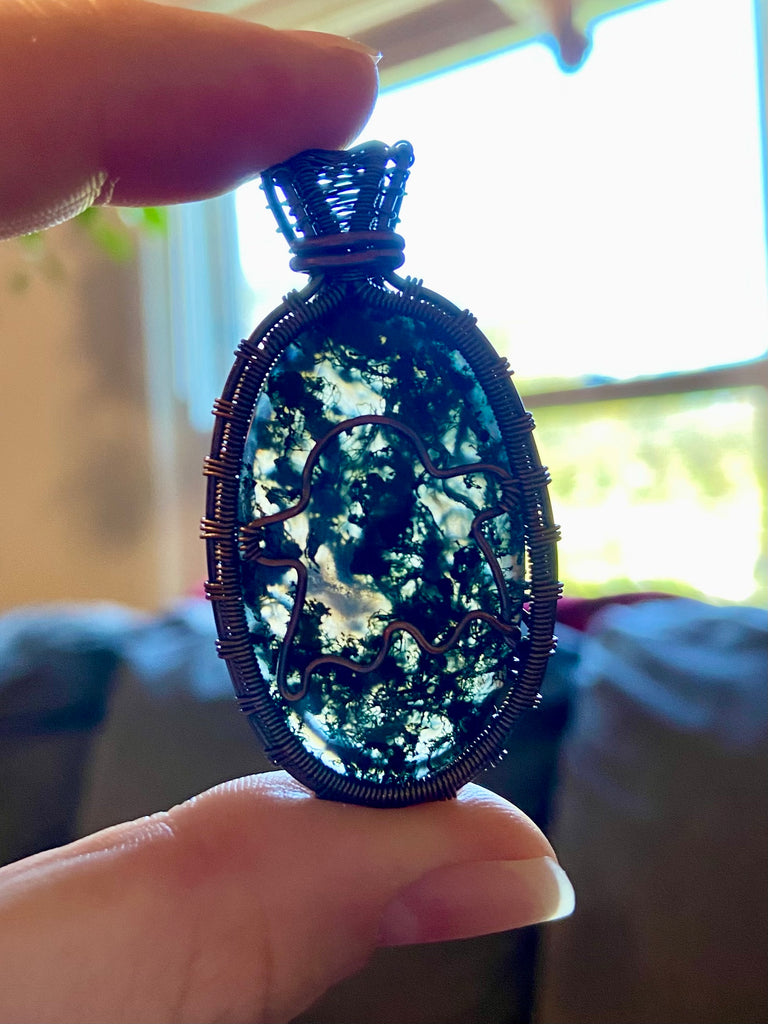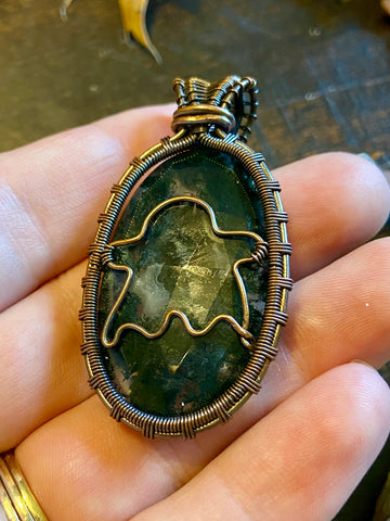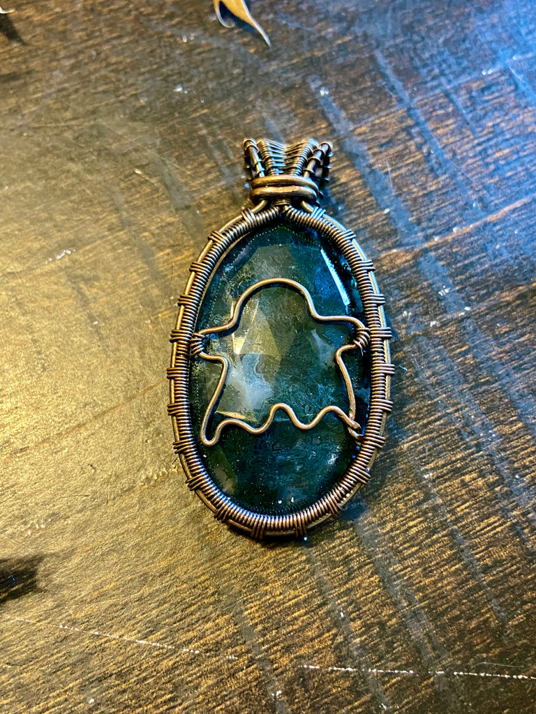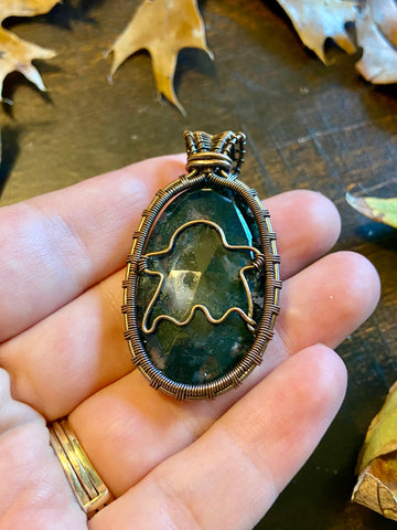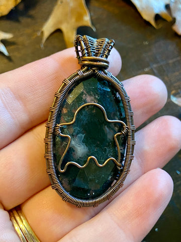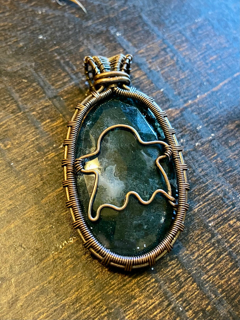 Copper wire wrapped ghost pendant with a checker cut moss agate. Finished with a patina and light polish. Comes with an adjustable black rope necklace.