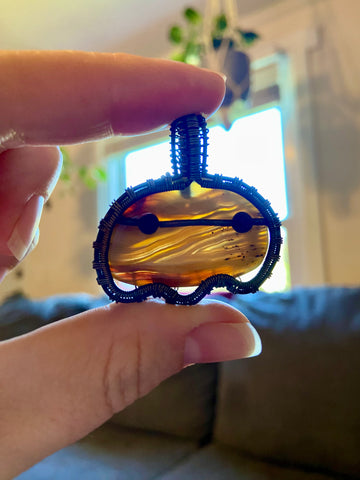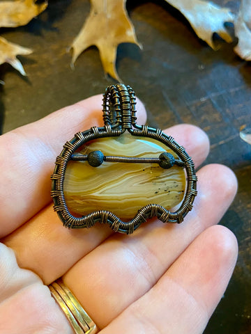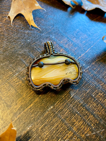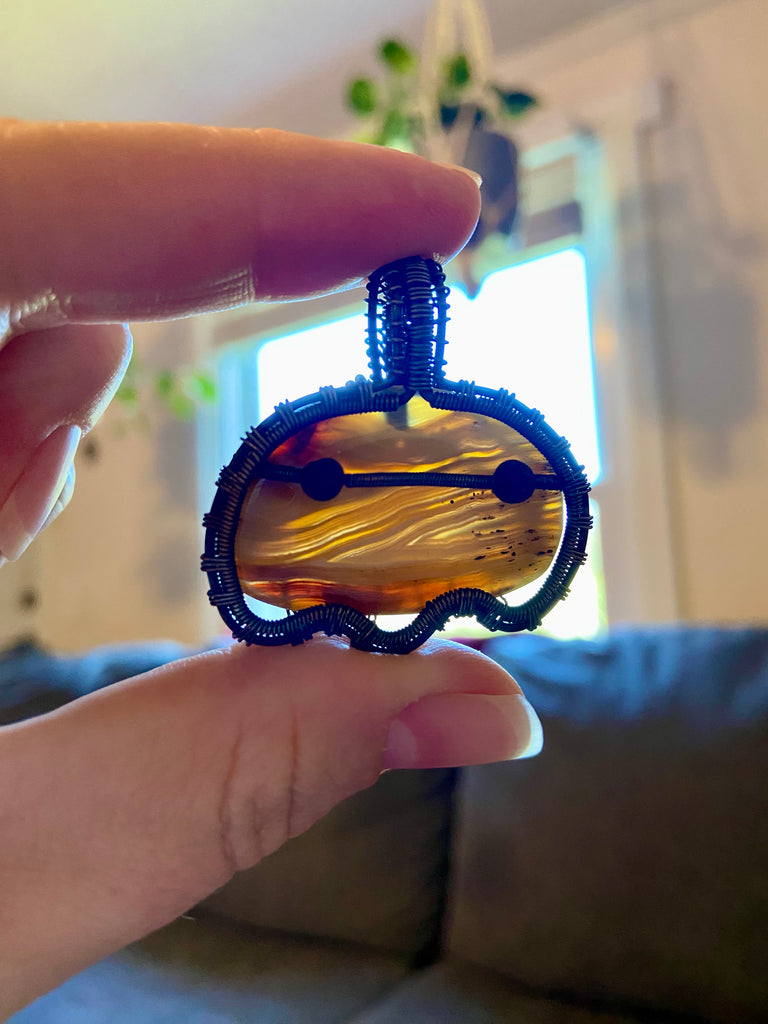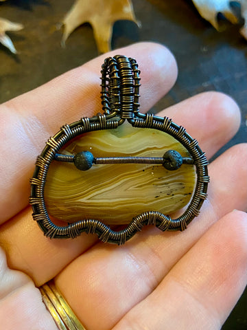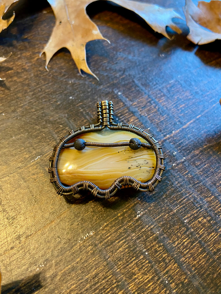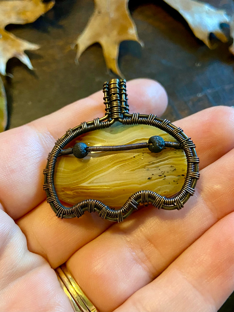Copper wire wrapped ghost pendant with a yellow Botswana agate body and lava rock eyes. Finished with a patina and light polish. Comes with an adjustable black rope necklace.