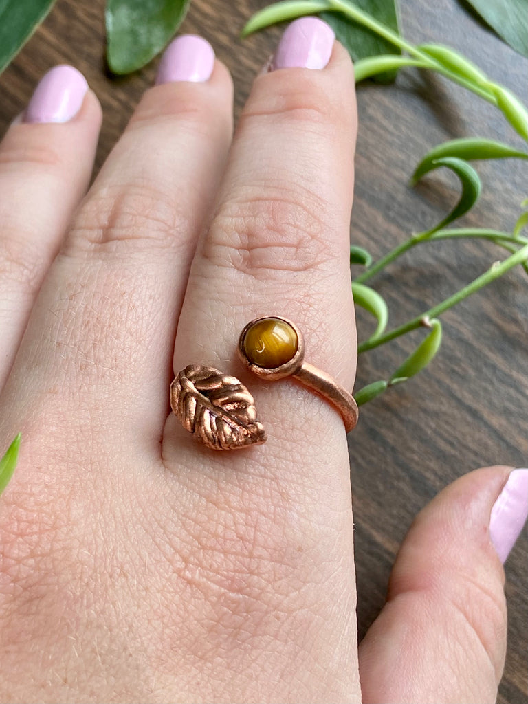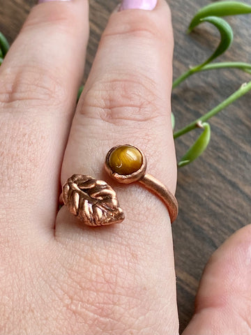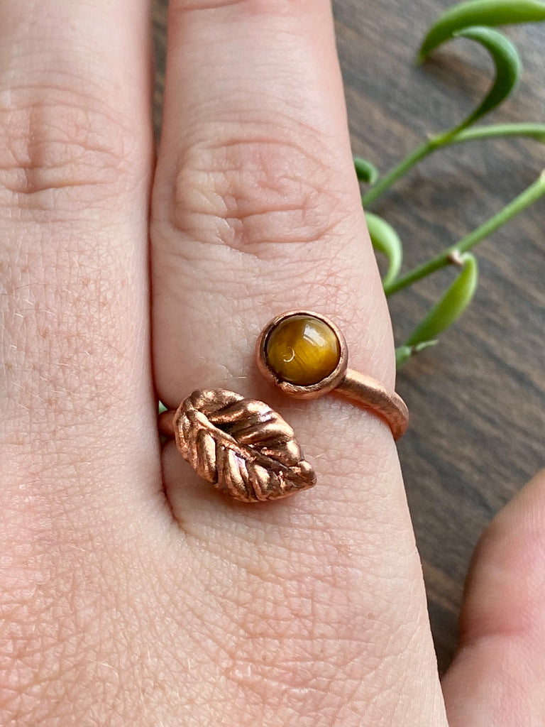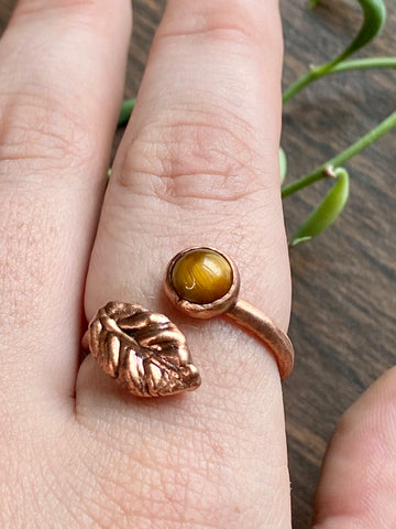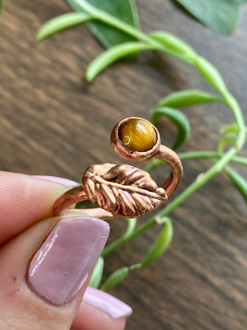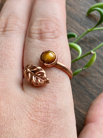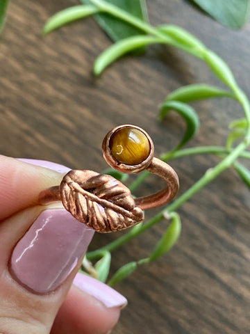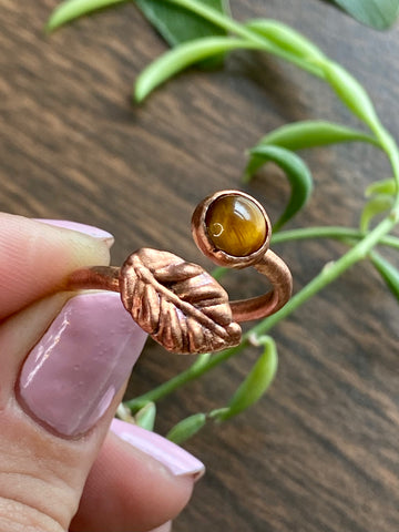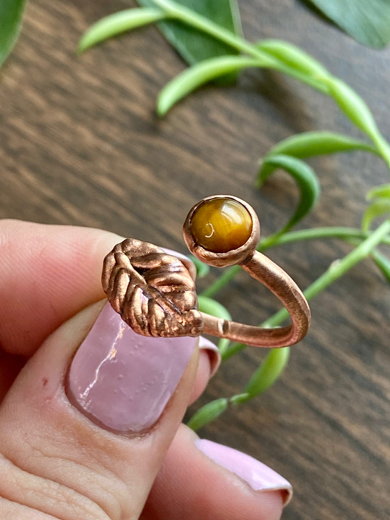Handmade copper electro formed ring with a round tiger eye and a leaf.