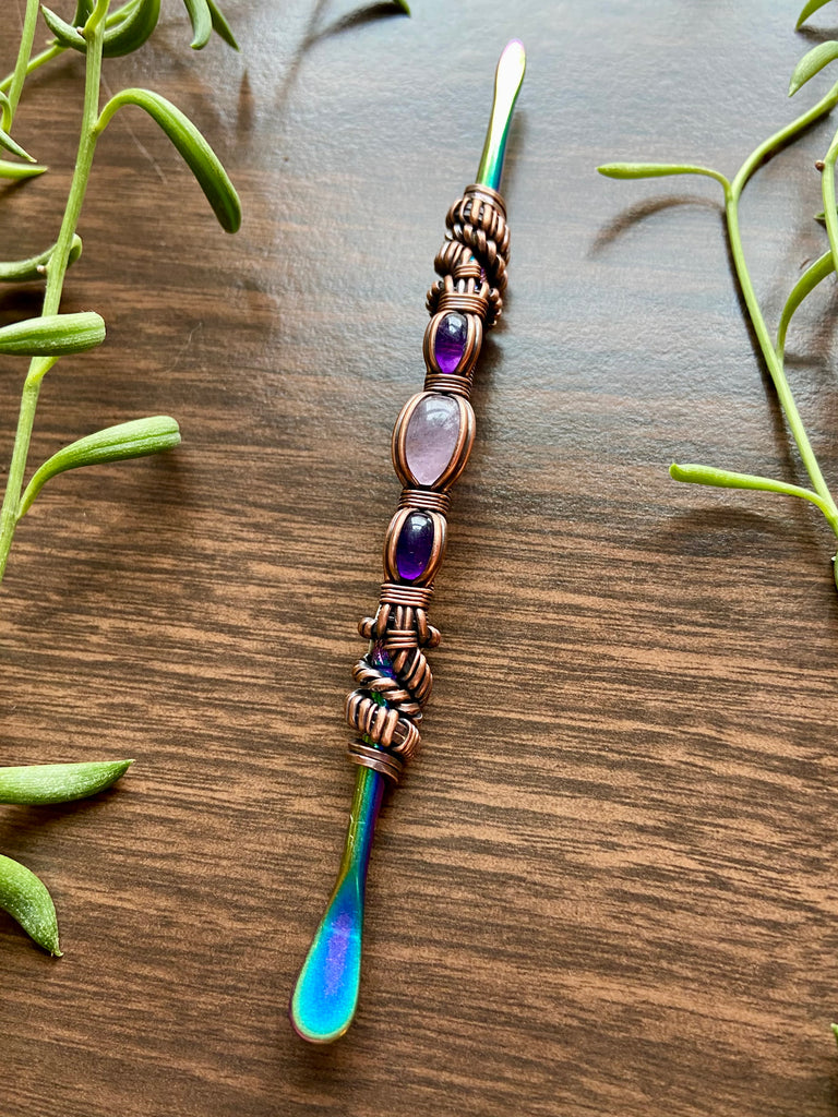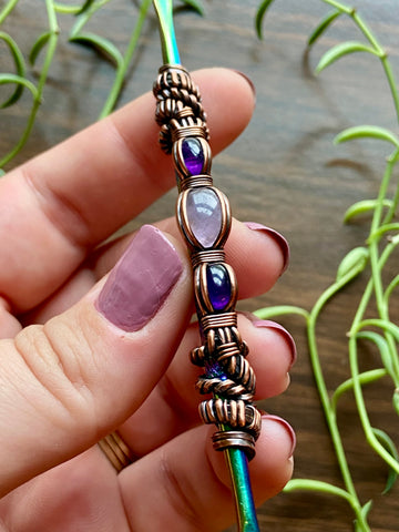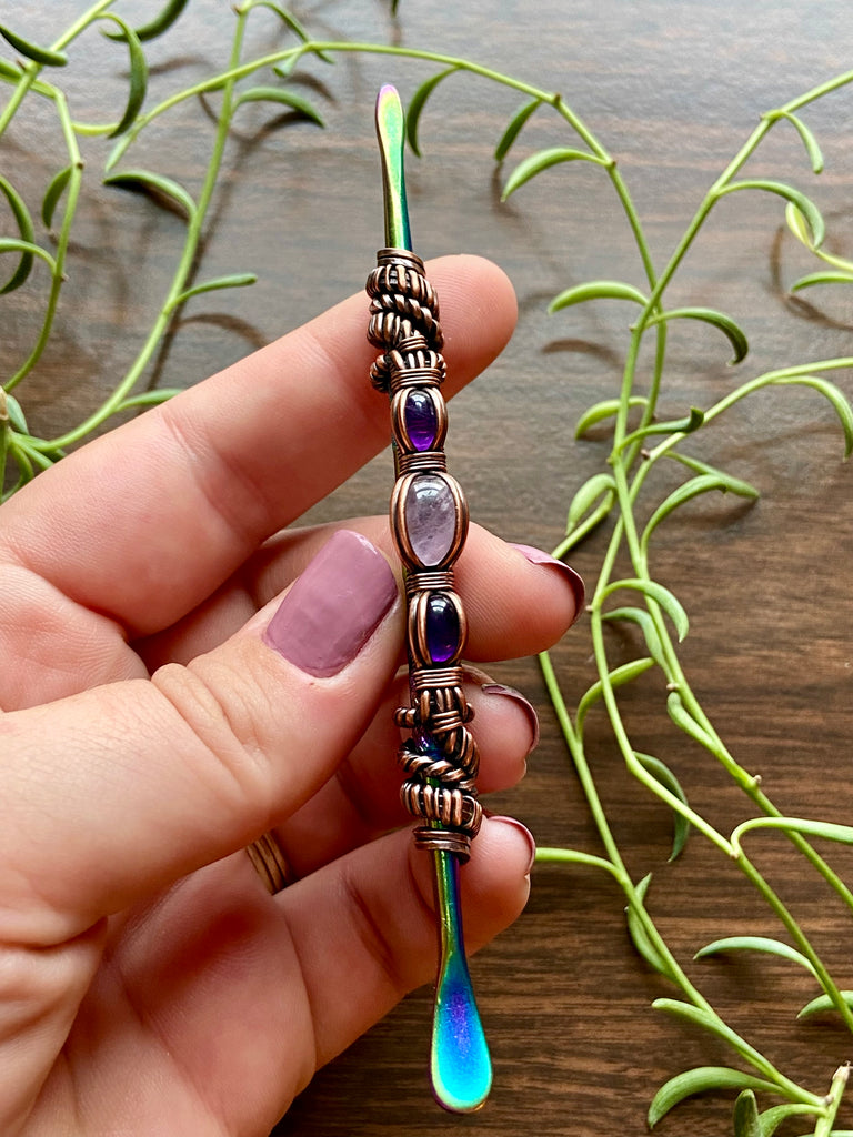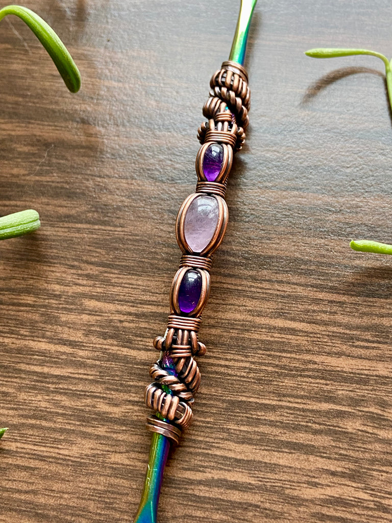 Five inch stainless steel rainbow dabber wire wrapped in copper with two amethyst and one lilac jade. Finished with a patina and polish.