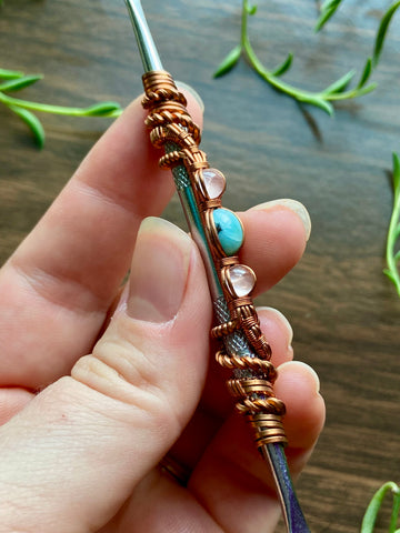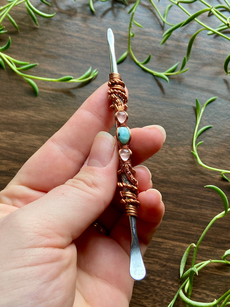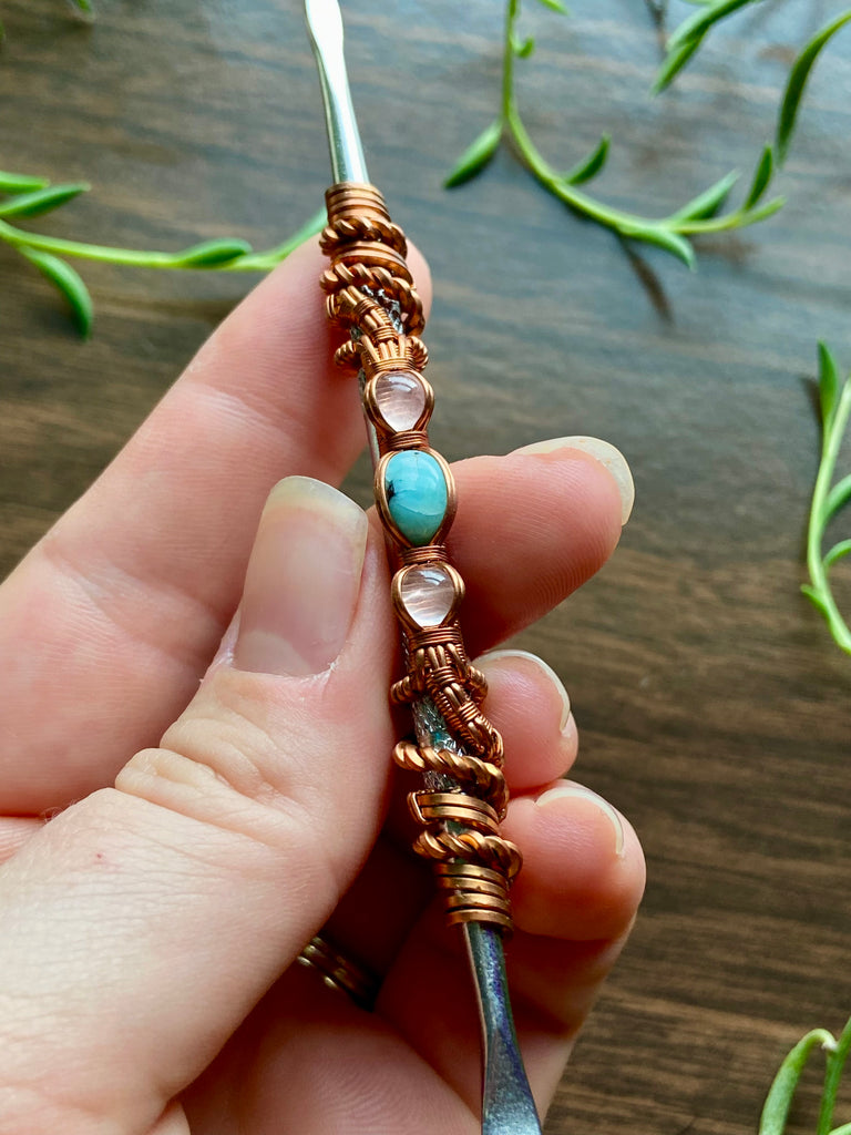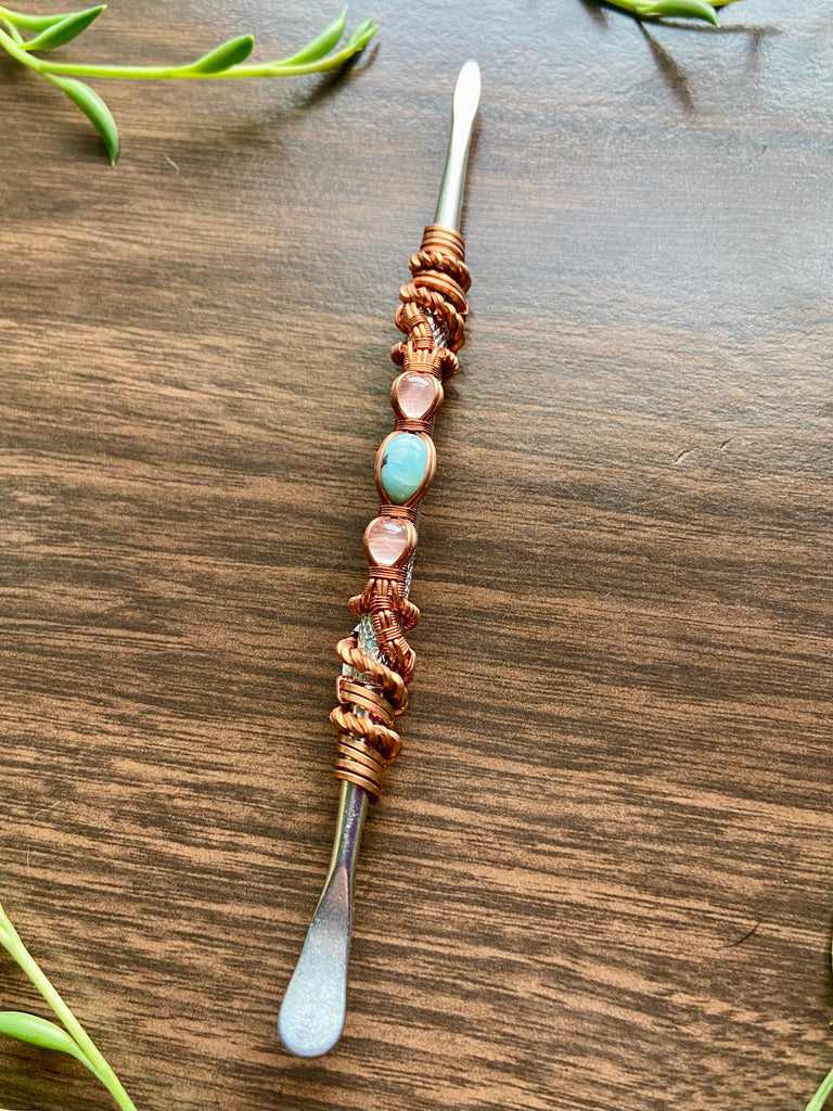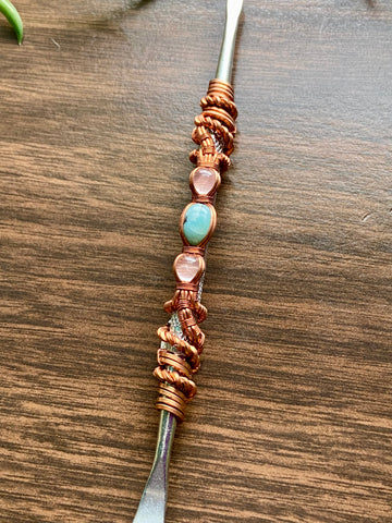 Five inch stainless steel silver dabber wire wrapped in bare copper with two pink rose quartz and one blue larimar center piece.