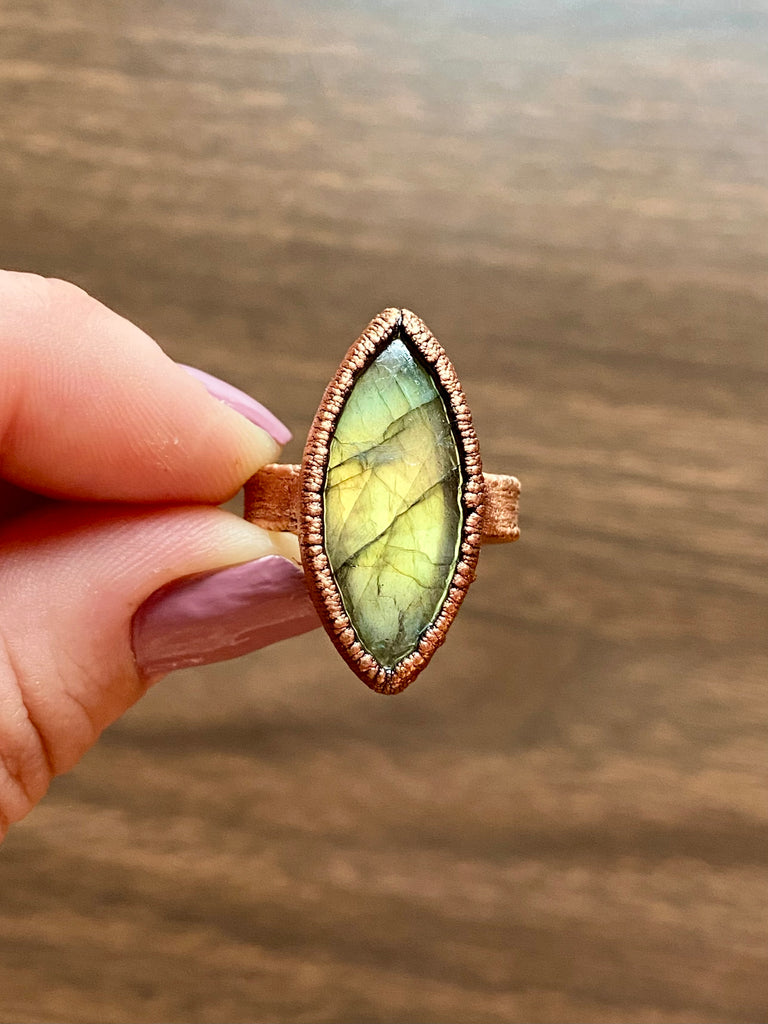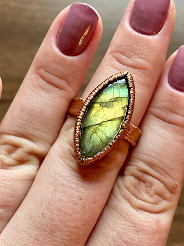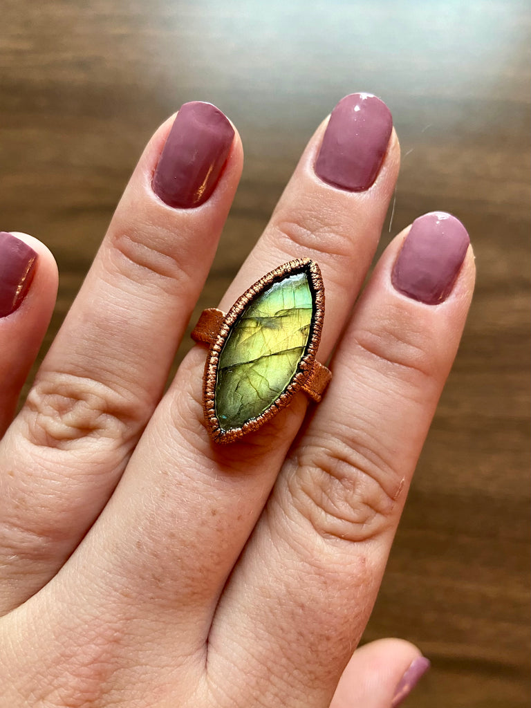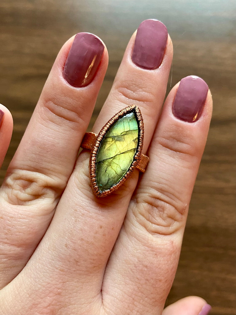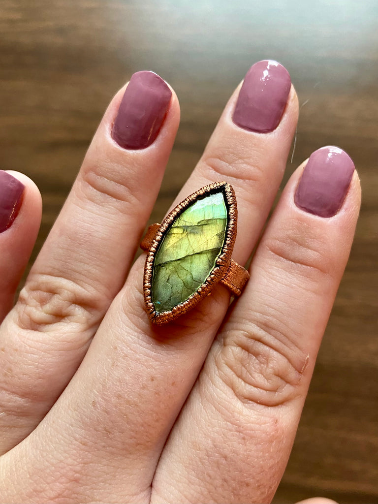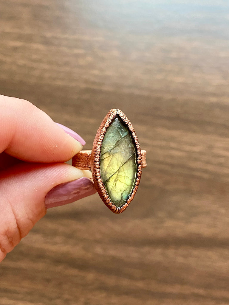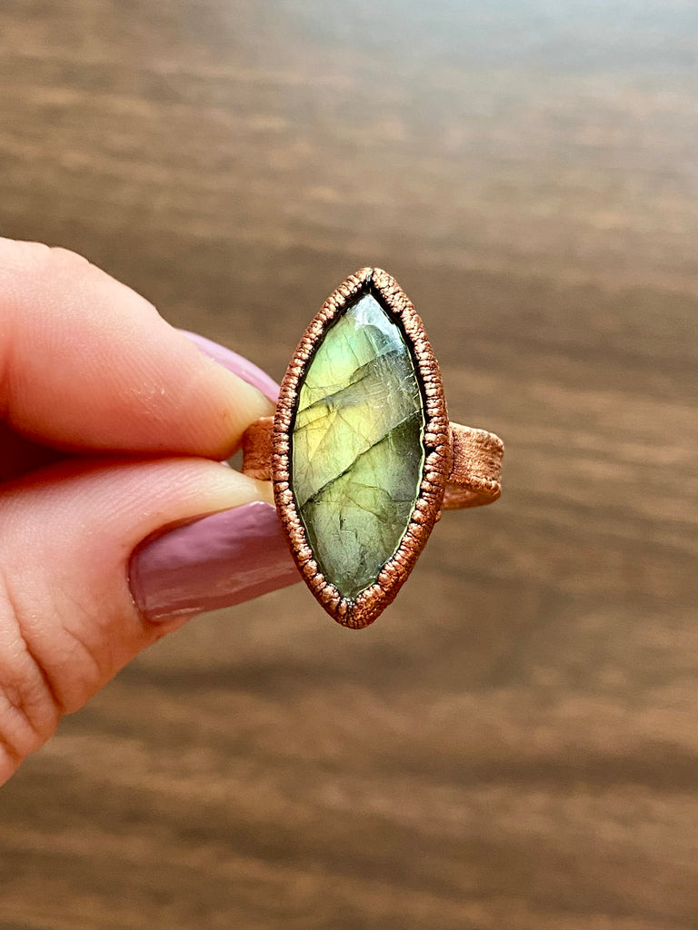 Handmade thick banded copper electro formed green and golden labradorite ring finished with a patina and polish. Size 8.25.