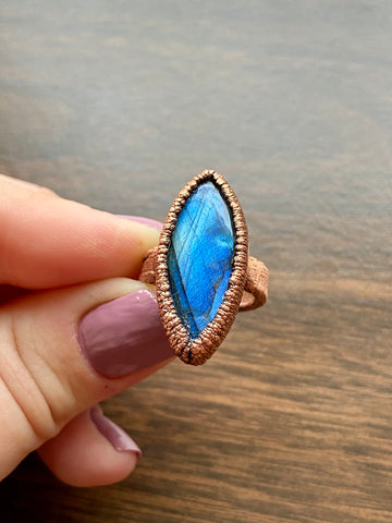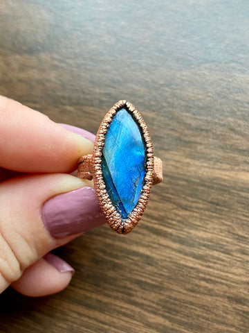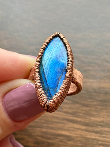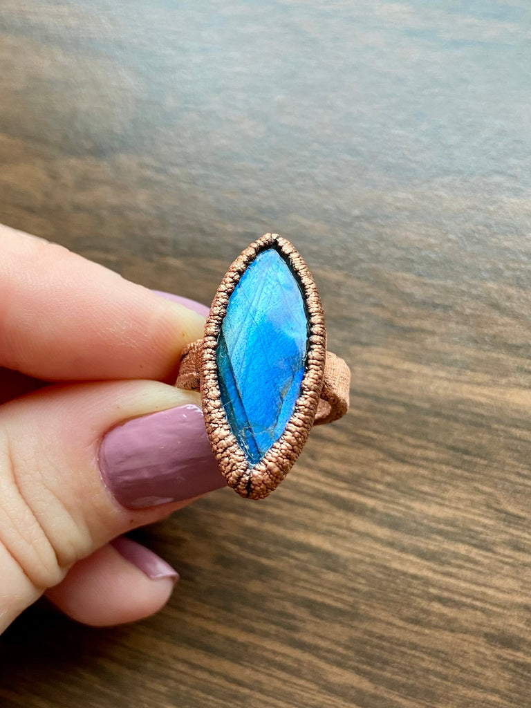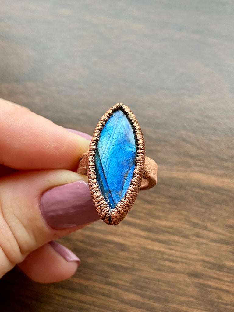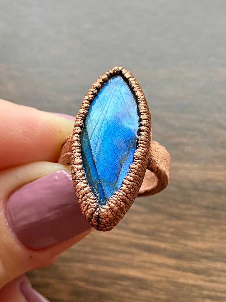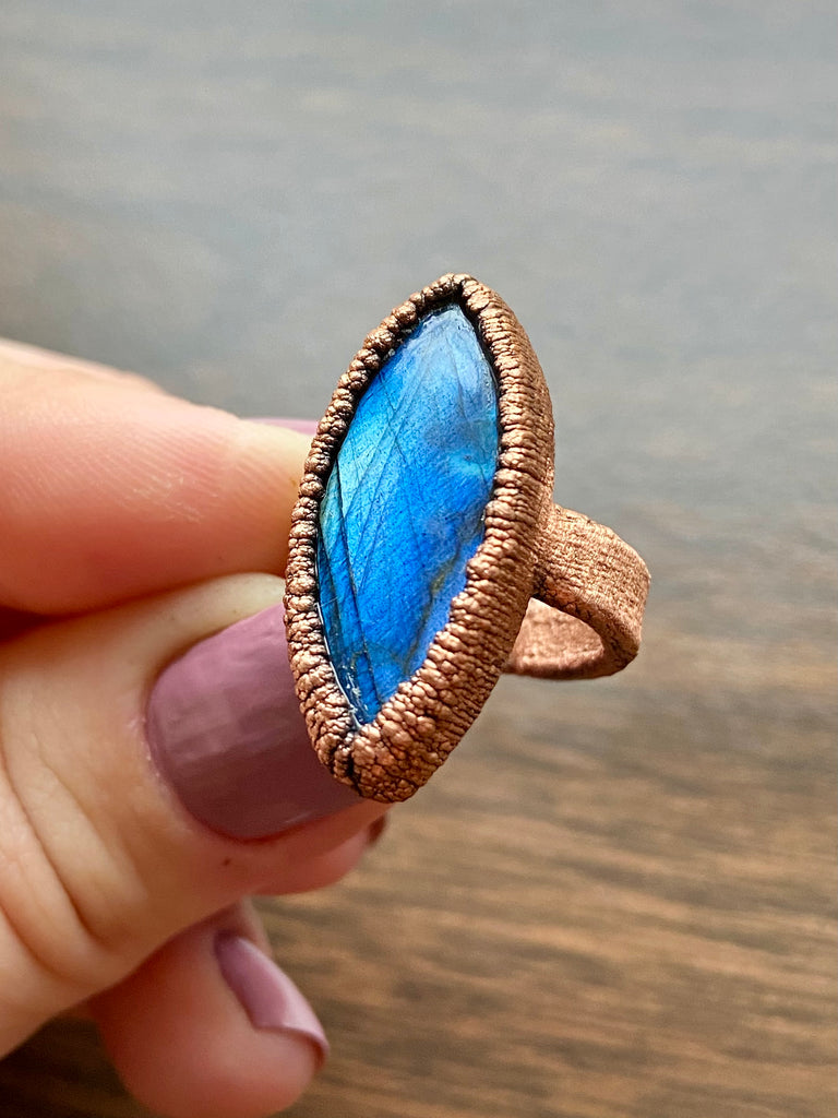 Handmade thick banded copper electro formed light blue labradorite ring finished with a patina and polish. Size 4.75.
