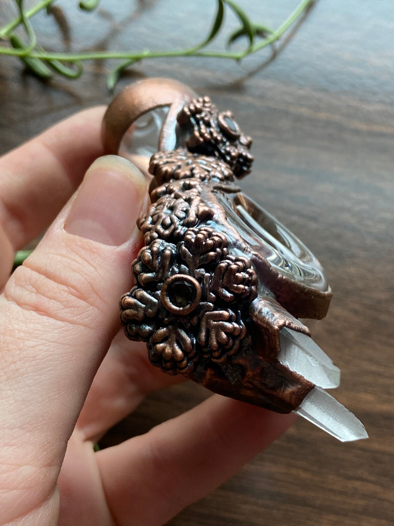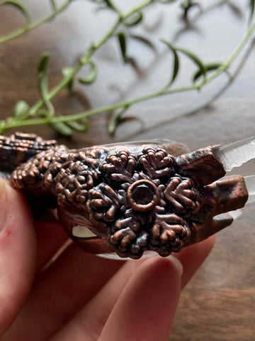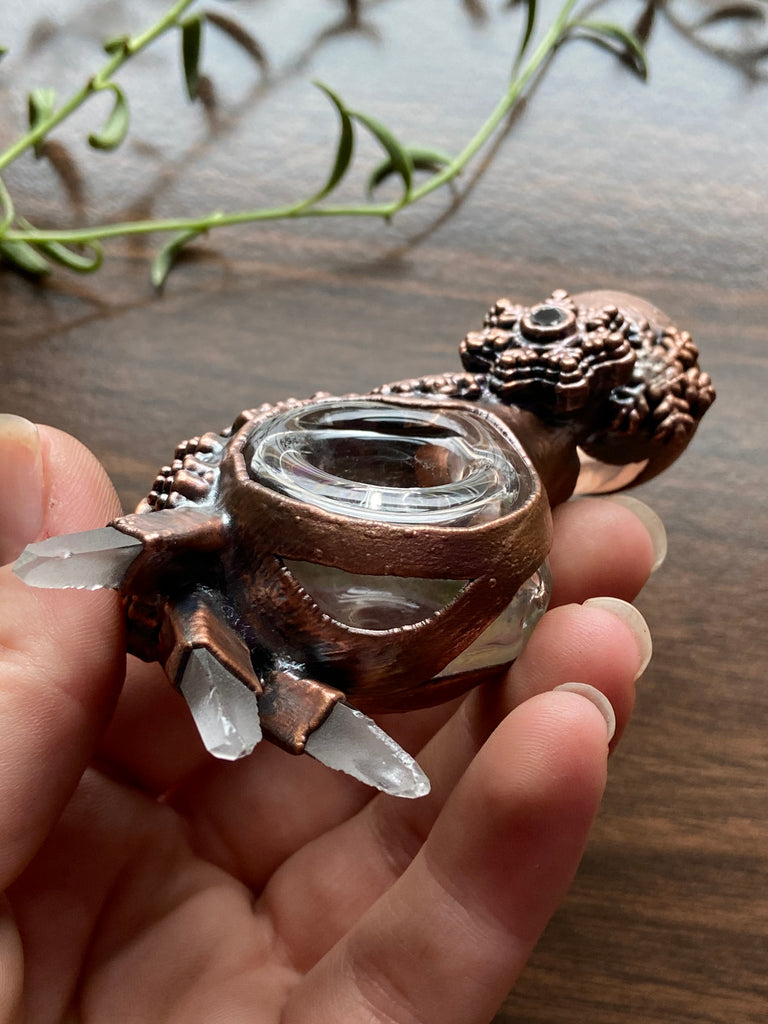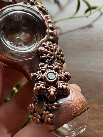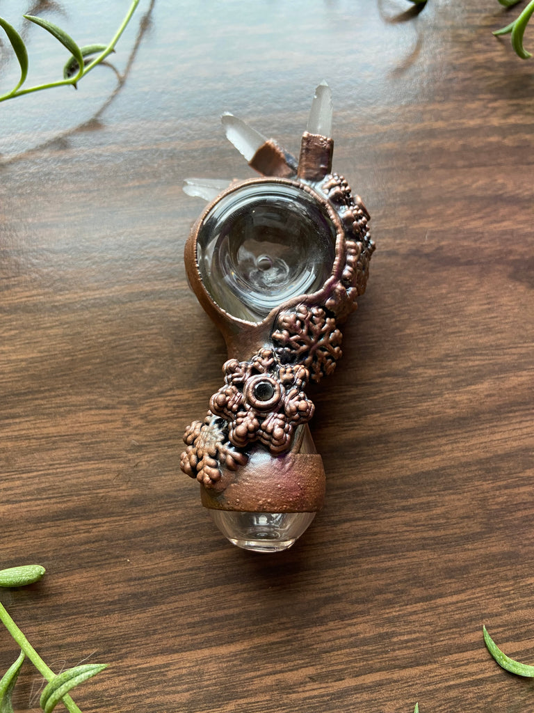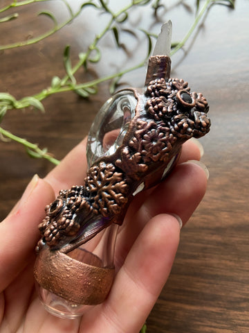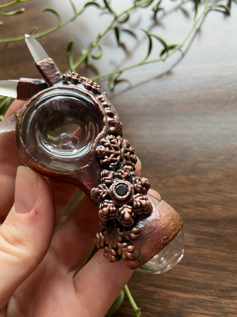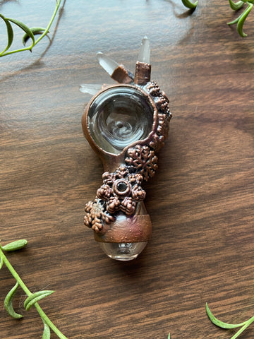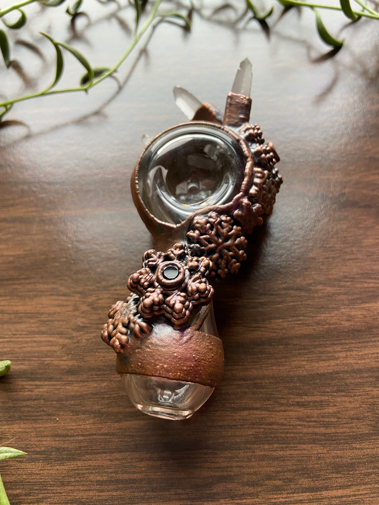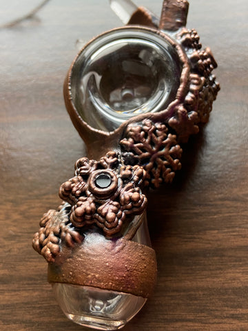 Three inch handblown borosilicate clear glass pipe with a left sided carb. Features a blanket of snow and a couple sweet little smoky quartz set in the snowflakes, electro formed in copper!